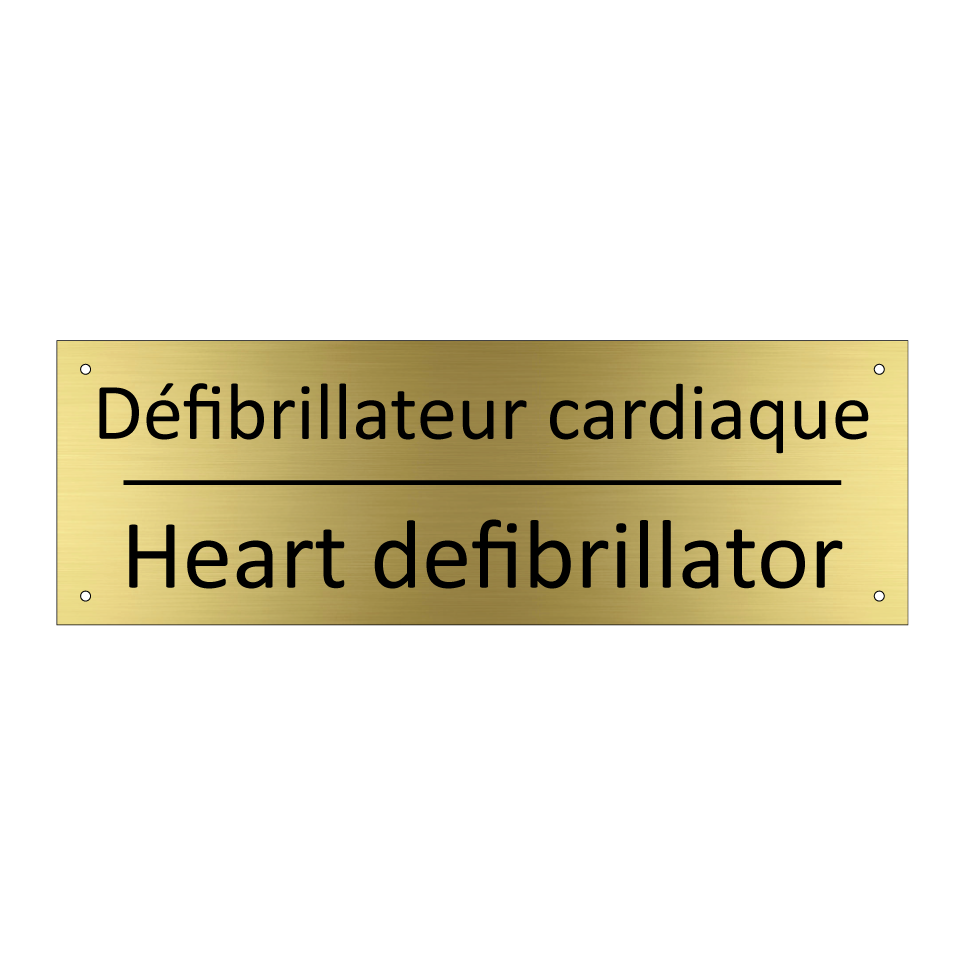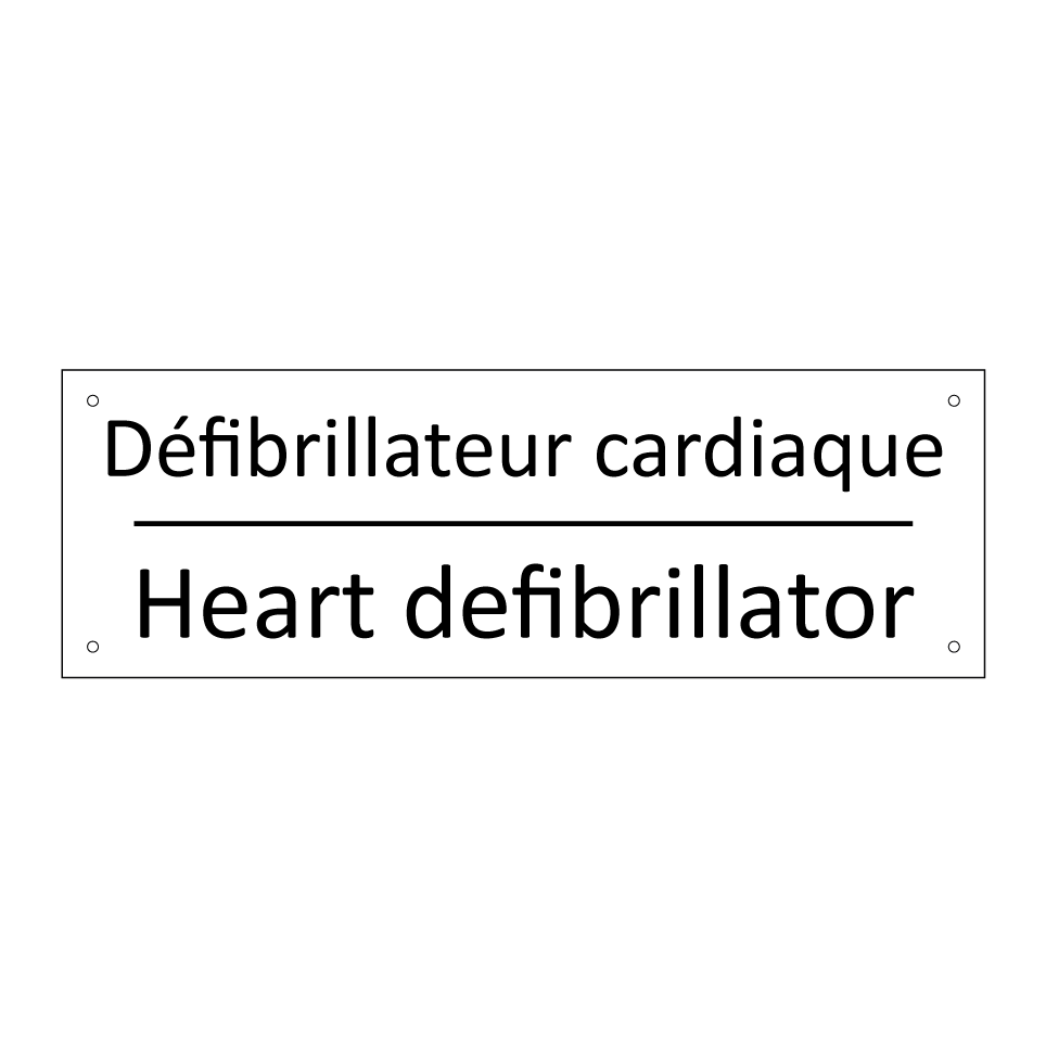 Panneau d'information avec le texte Défibrillateur cardiaque|Heart defibrillator en français et en anglais.