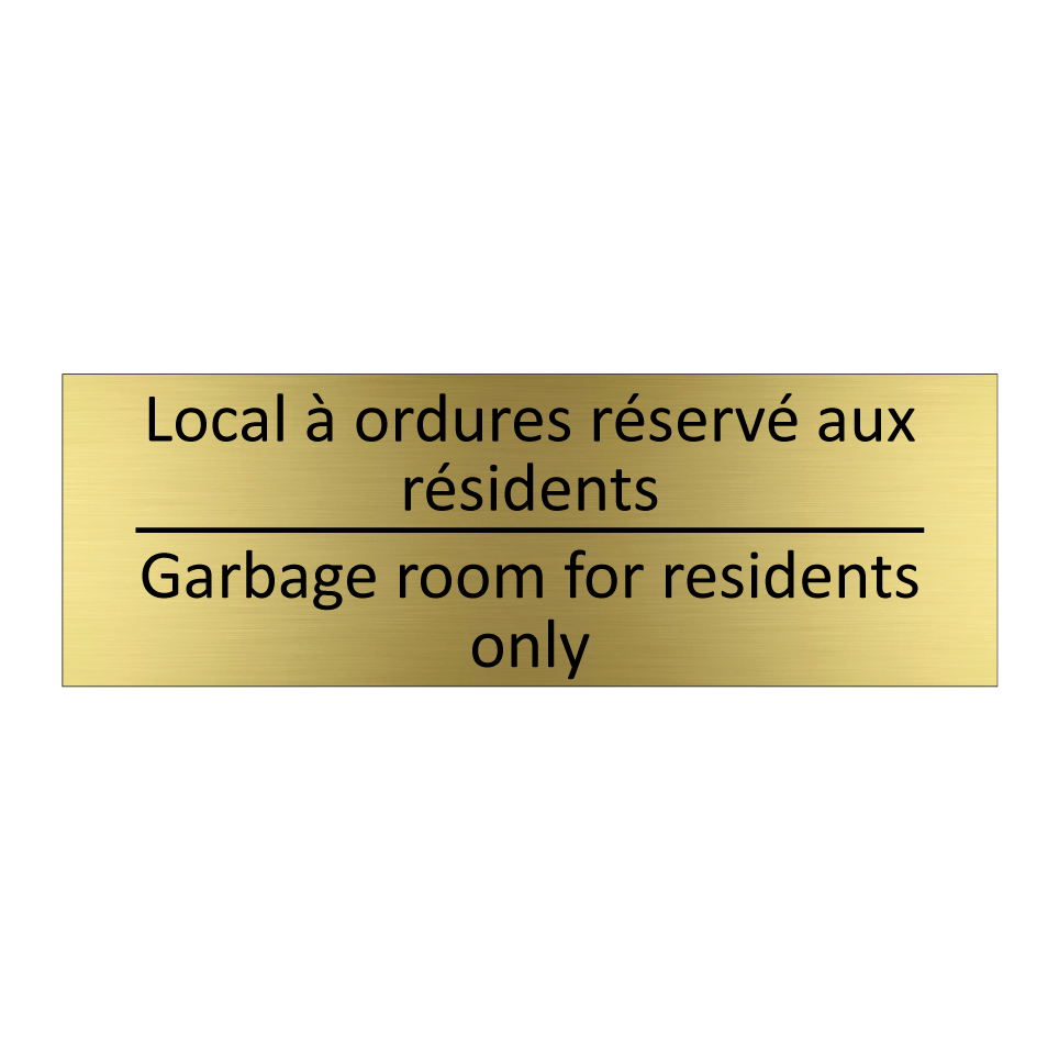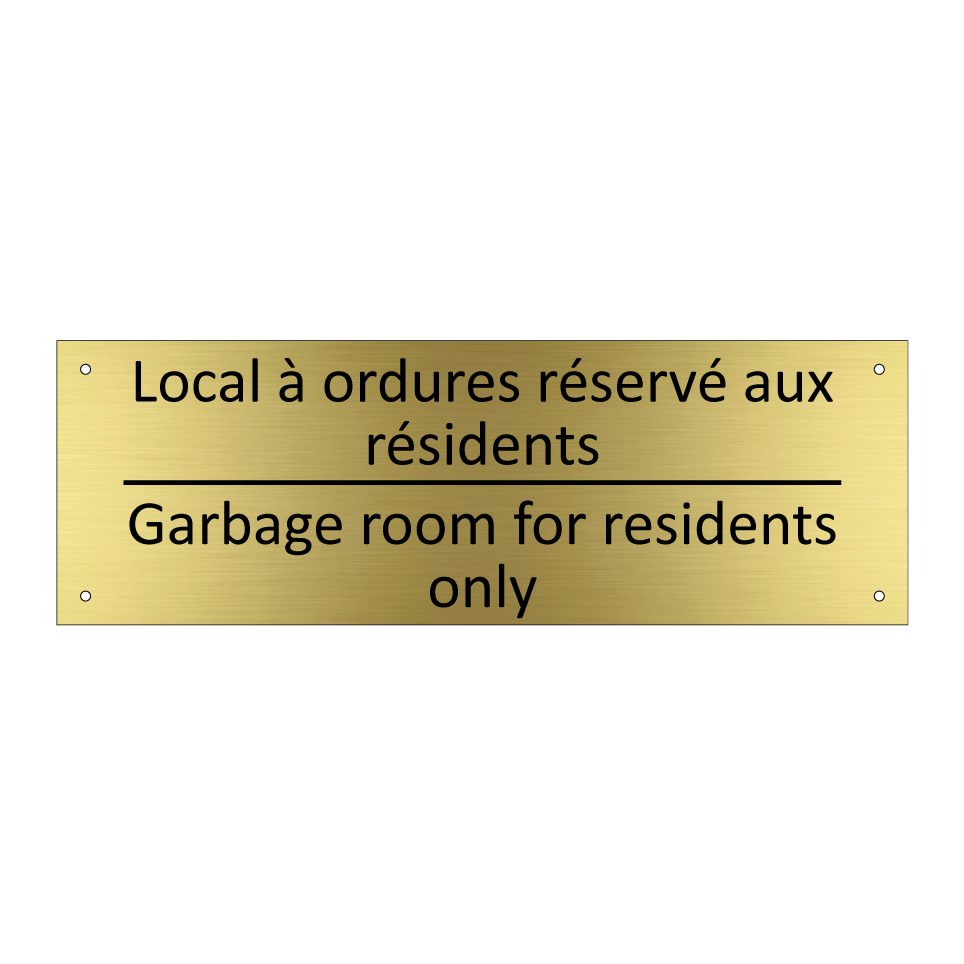 Panneau d'information avec le texte Local à ordures réservé aux résidents|Garbage room for residents only en français et en anglais.