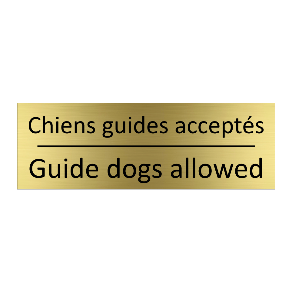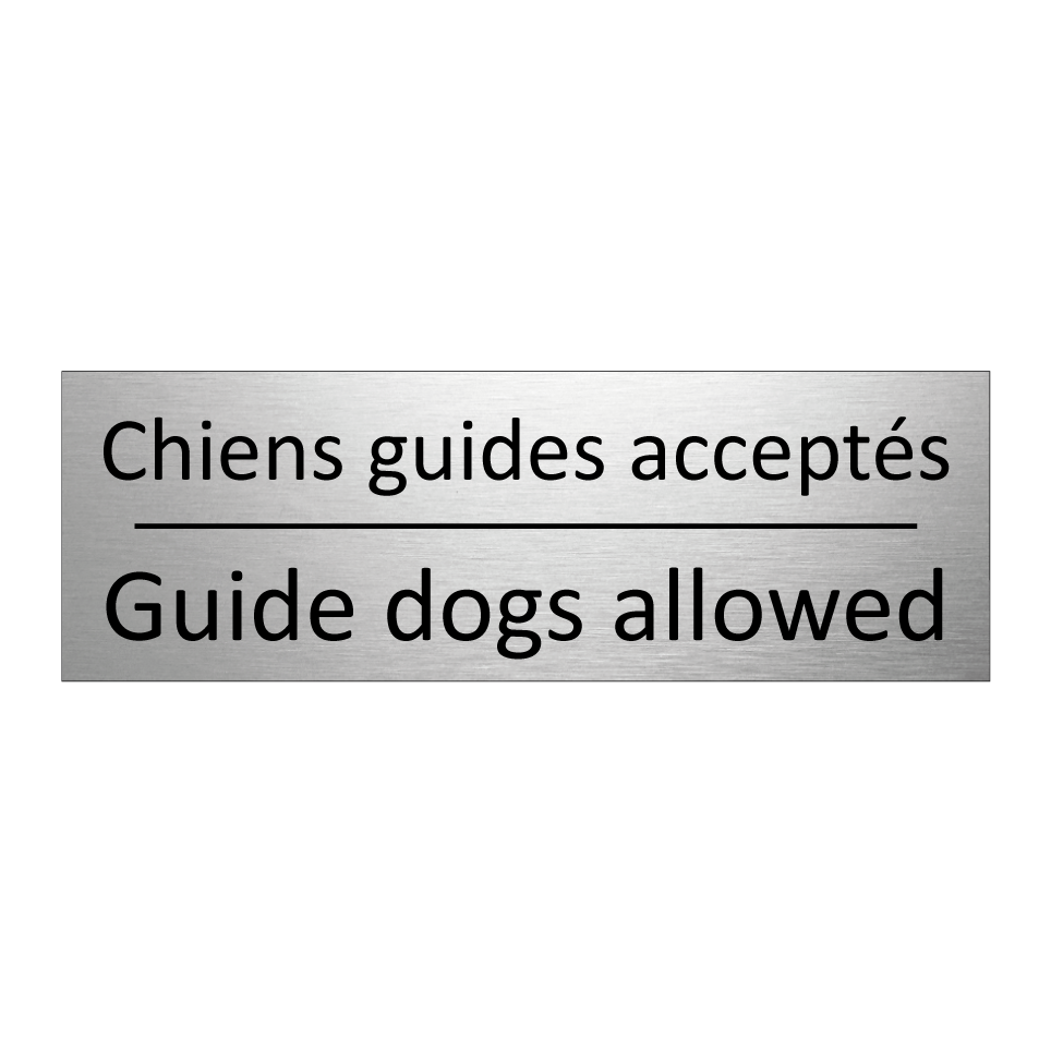 Panneau d'information avec le texte Chiens guides acceptés|Guide dogs allowed en français et en anglais.