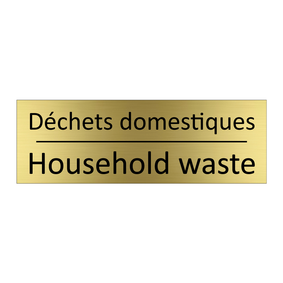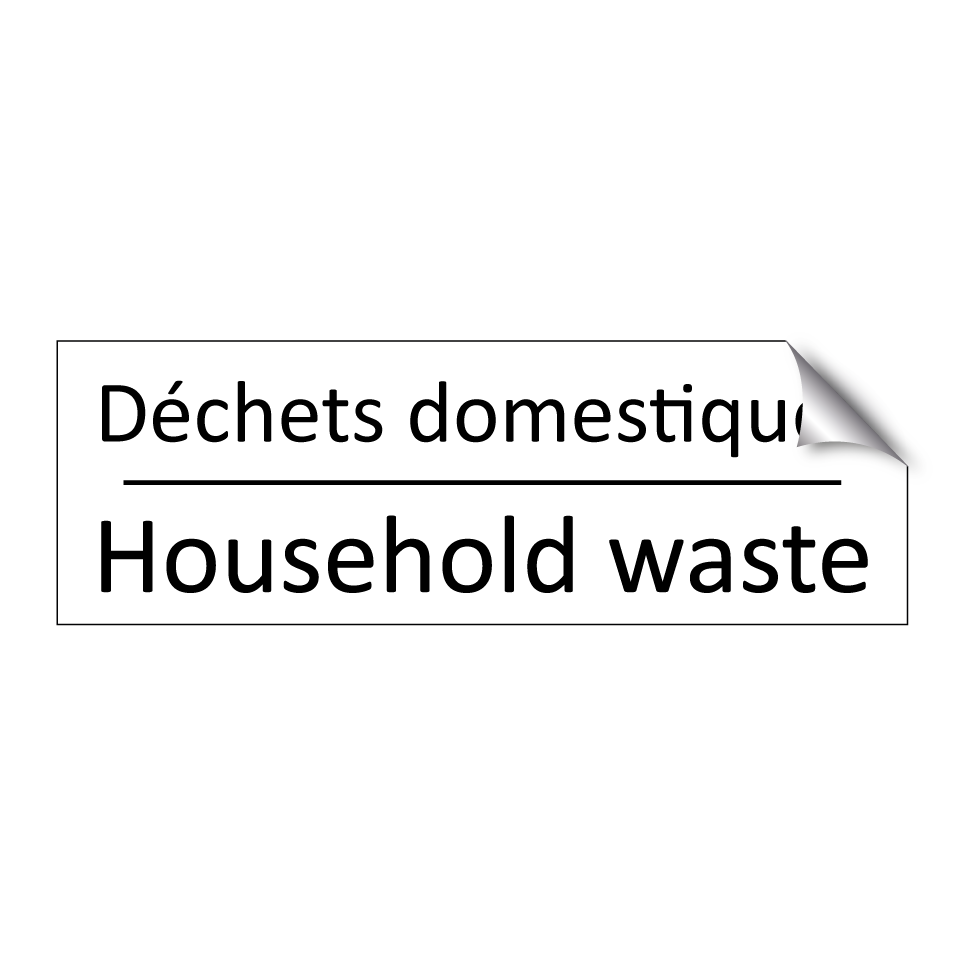 Panneau d'information avec le texte Déchets domestiques|Household waste en français et en anglais.