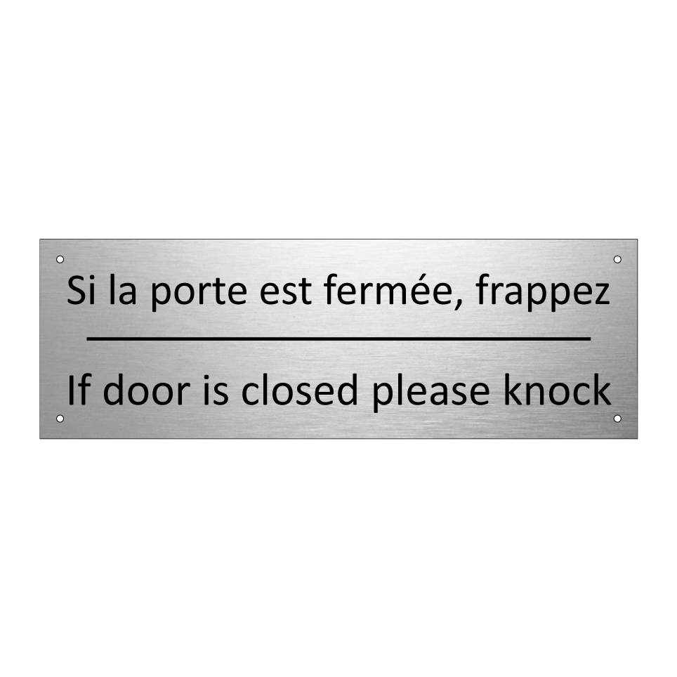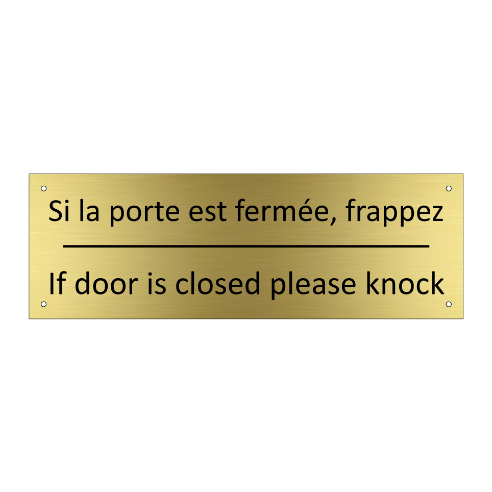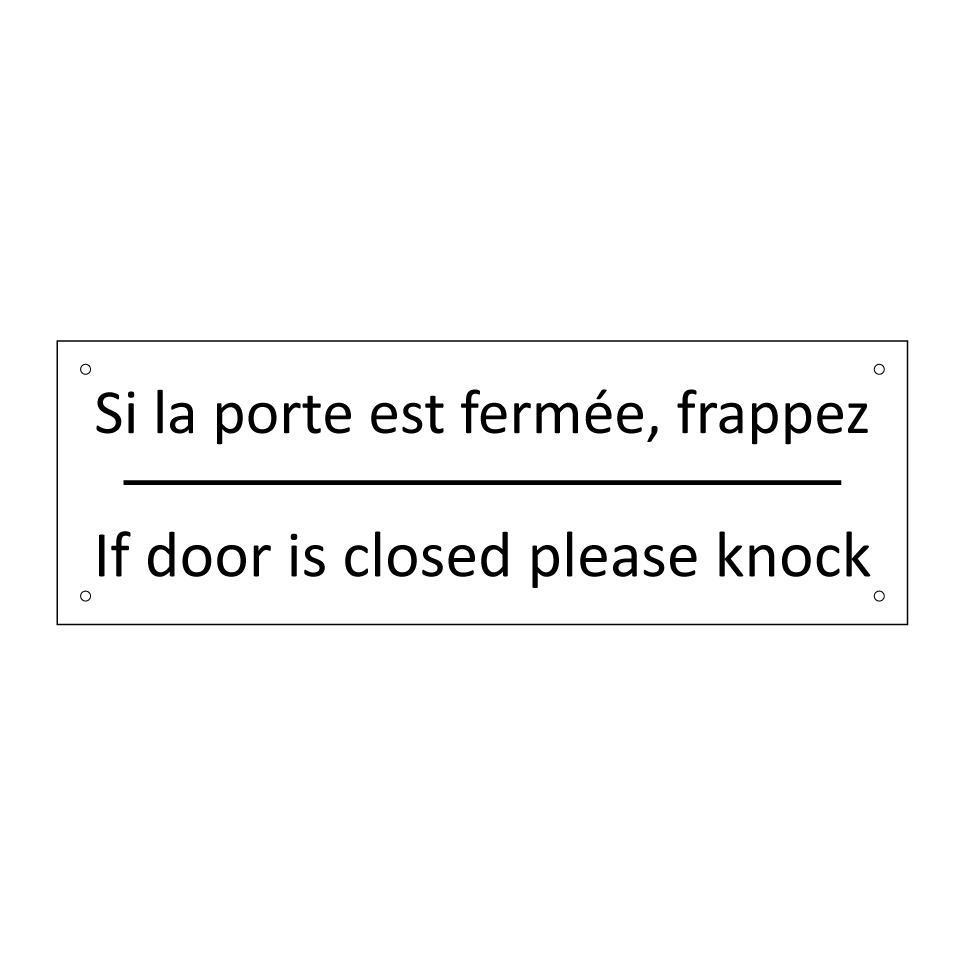 Panneau d'information avec le texte Si la porte est fermée, frappez|If door is closed please knock en français et en anglais.