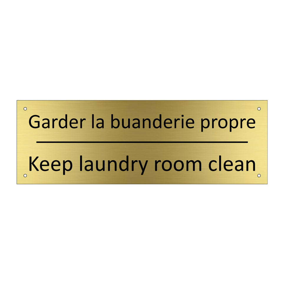 Panneau d'information avec le texte Garder la buanderie propre|Keep laundry room clean en français et en anglais.