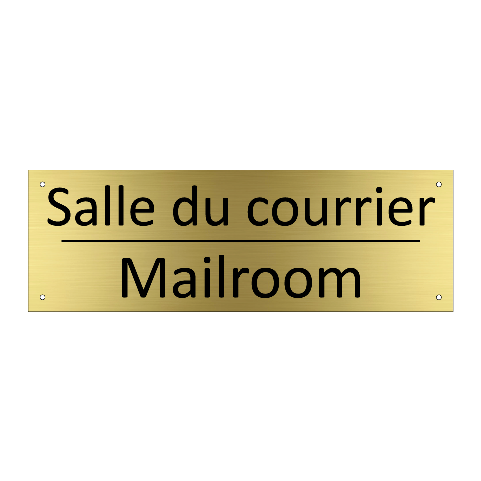Panneau d'information avec le texte Salle du courrier|Mailroom en français et en anglais.
