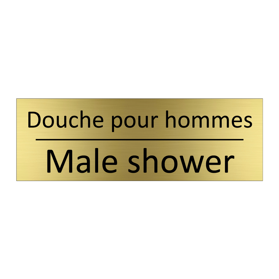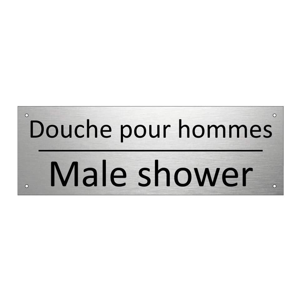Panneau d'information avec le texte Douche pour hommes|Male shower en français et en anglais.