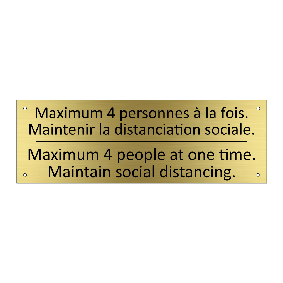 Panneau d'information avec le texte Maximum 4 personnes à la fois. Maintenir la distanciation sociale.|Maximum 4 people at one time. Maintain social distancing. en français et en anglais.