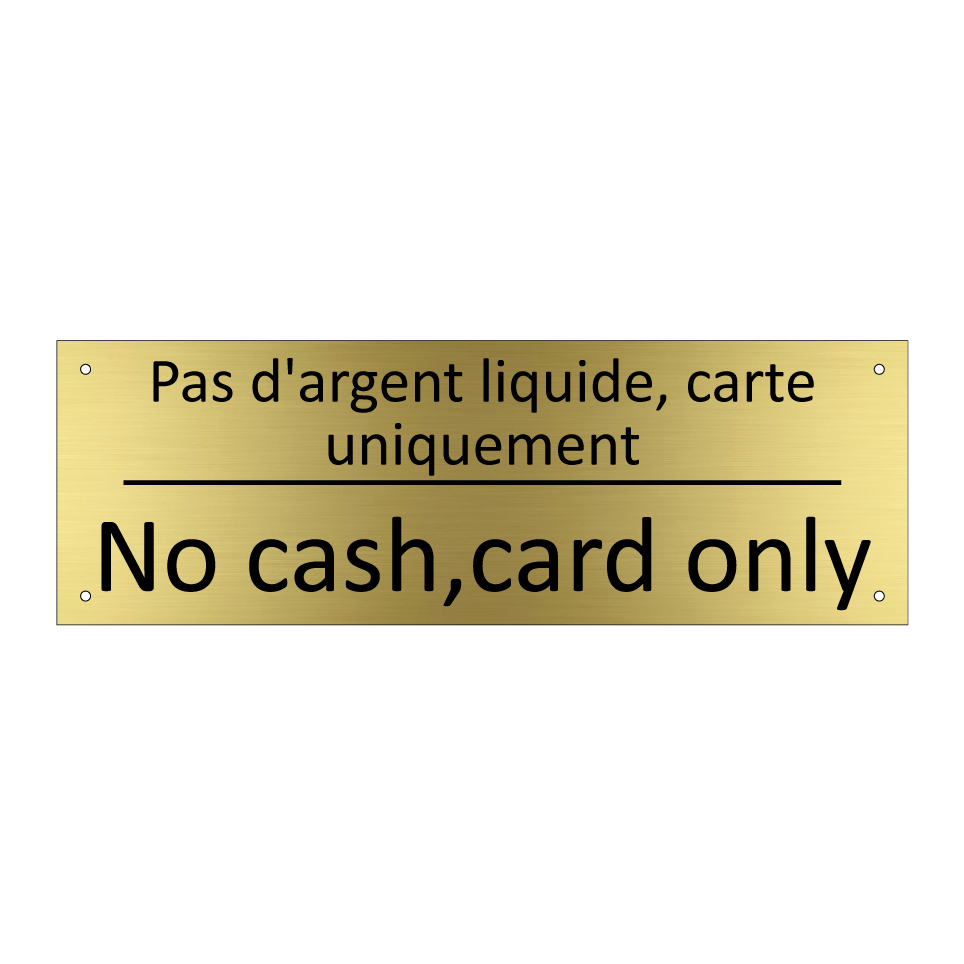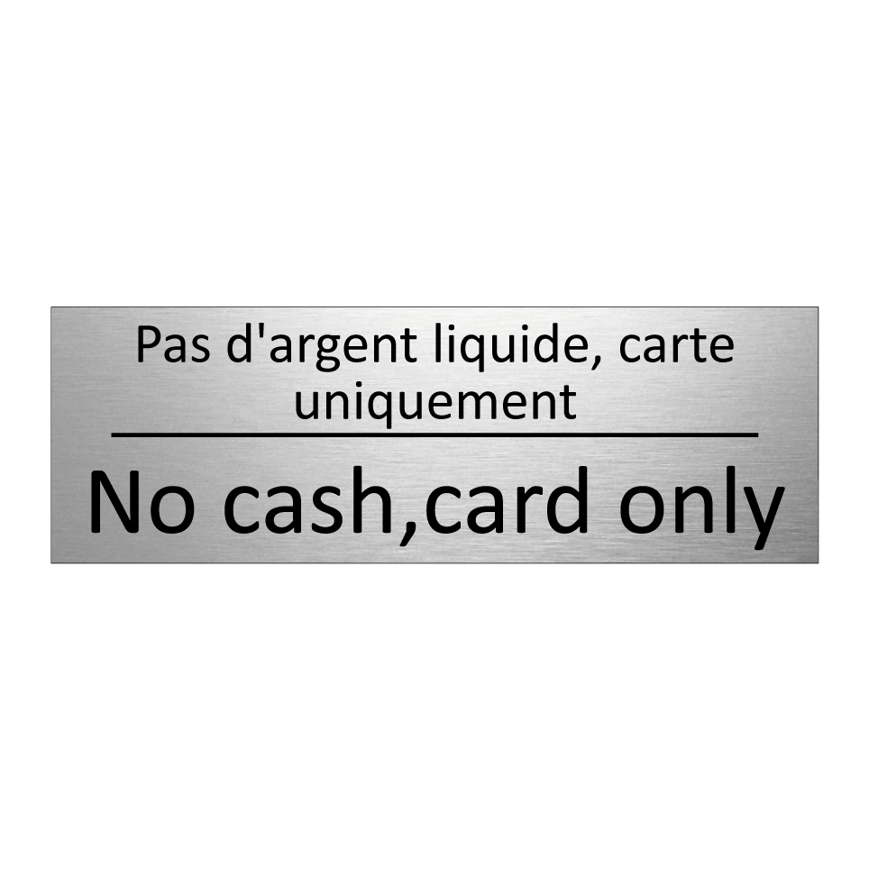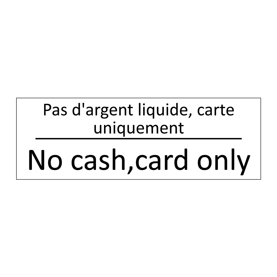 Panneau d'information avec le texte Pas d'argent liquide, carte uniquement|No cash,card only en français et en anglais.