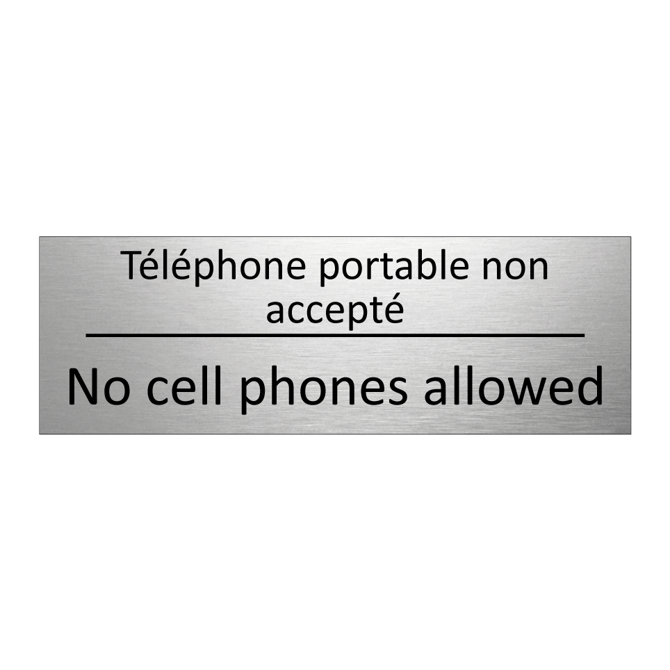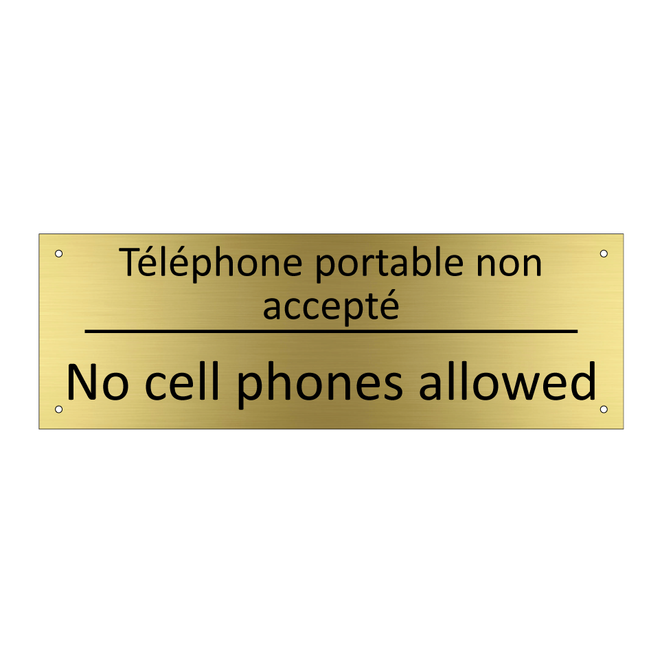 Panneau d'information avec le texte Téléphone portable non accepté|No cell phones allowed en français et en anglais.