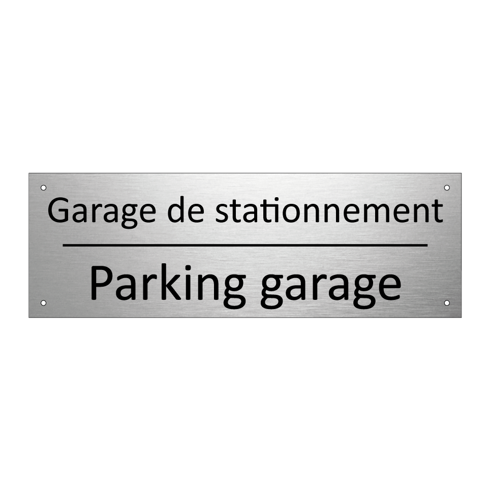 Panneau d'information avec le texte Garage de stationnement|Parking garage en français et en anglais.