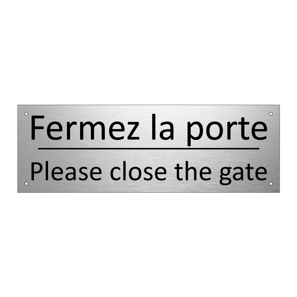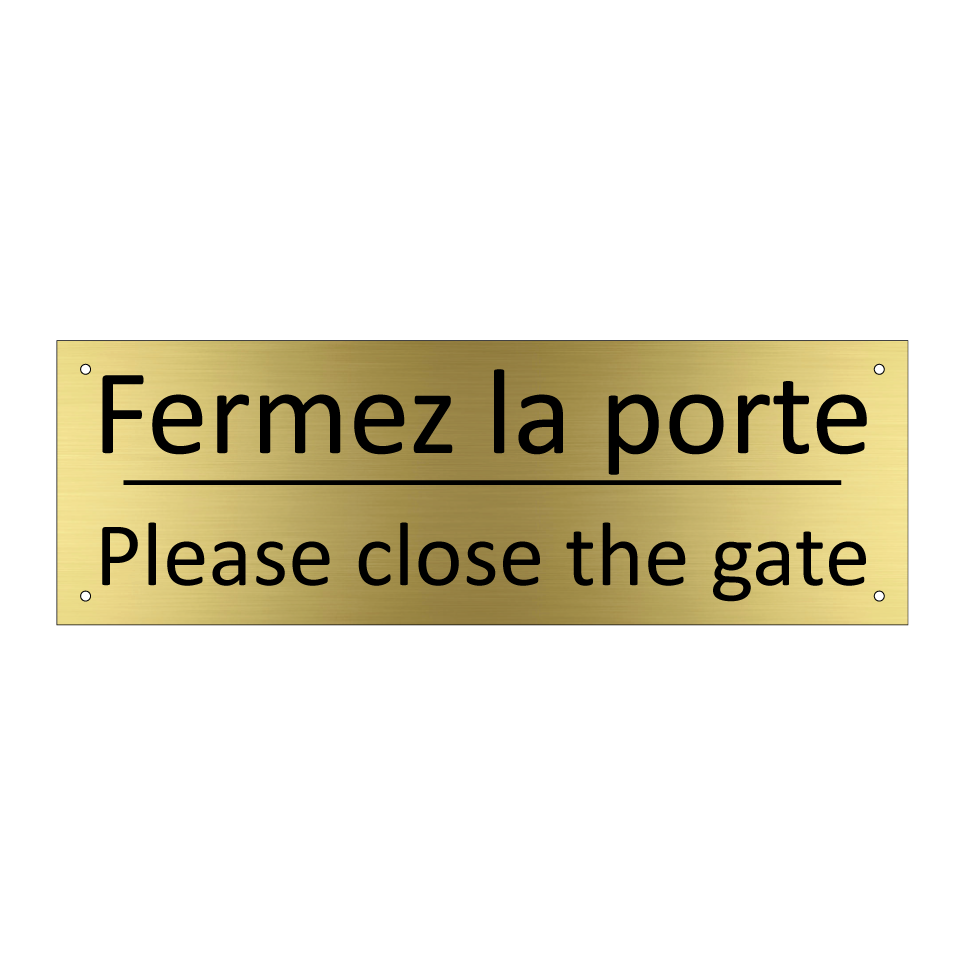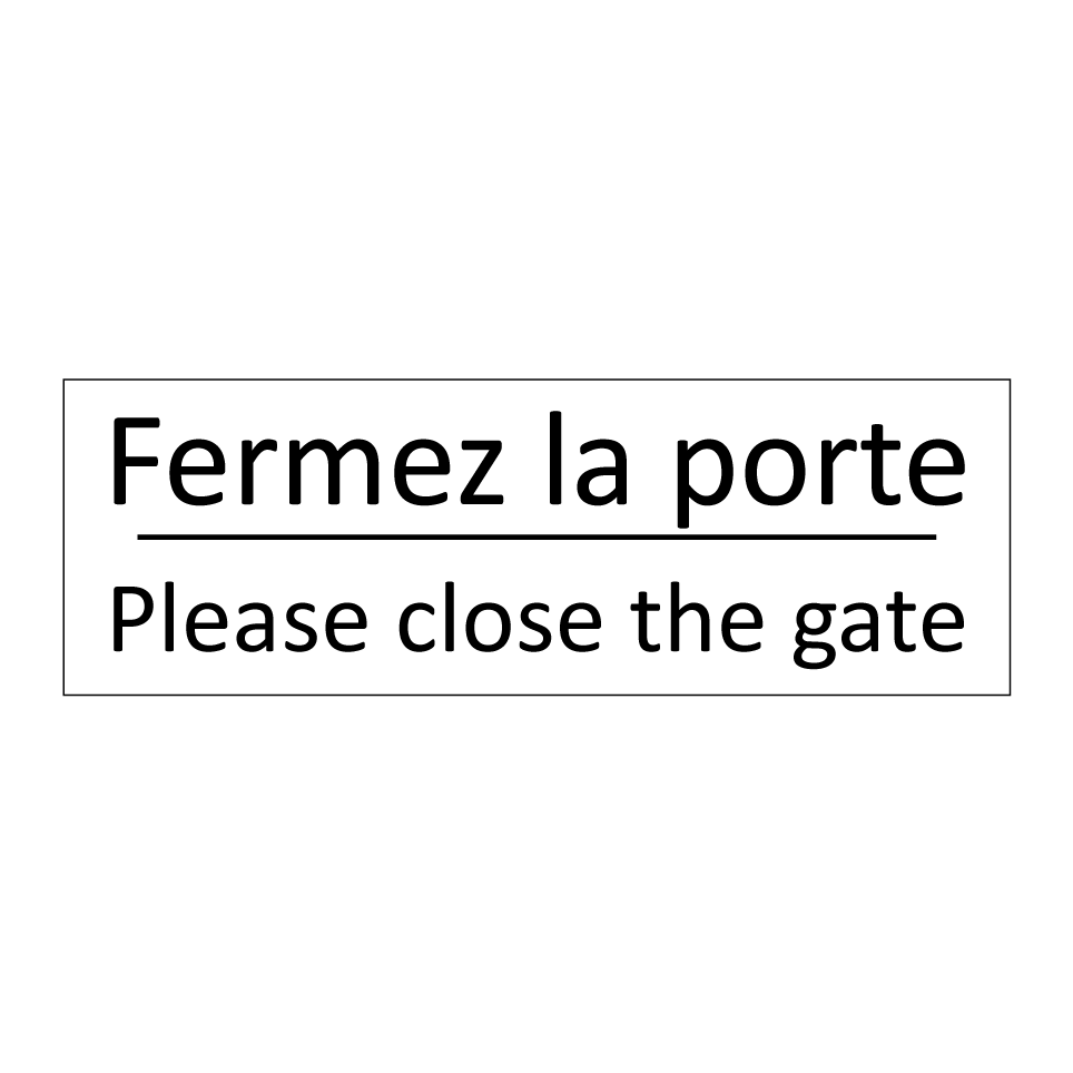 Panneau d'information avec le texte Fermez la porte|Please close the gate en français et en anglais.