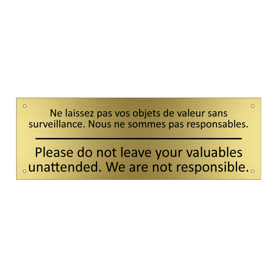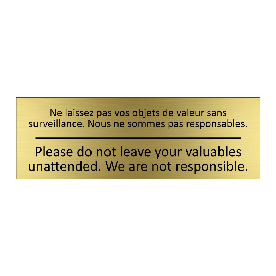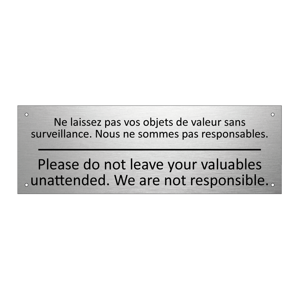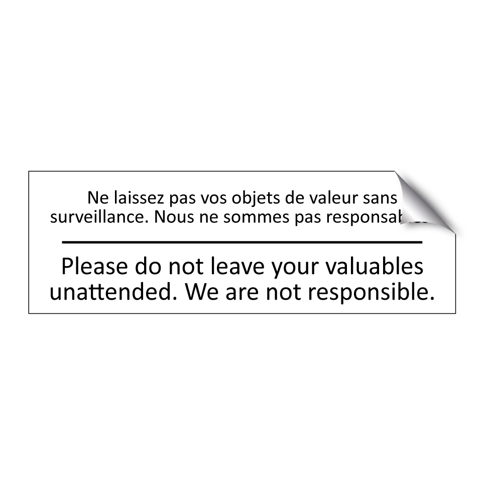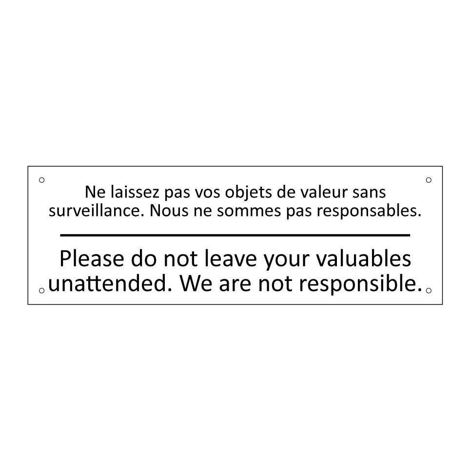 Panneau d'information avec le texte Ne laissez pas vos objets de valeur sans surveillance. Nous ne sommes pas responsables.|Please do not leave your valuables unattended. We are not responsible. en français et en anglais.