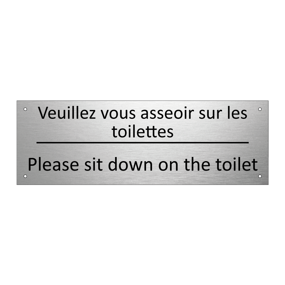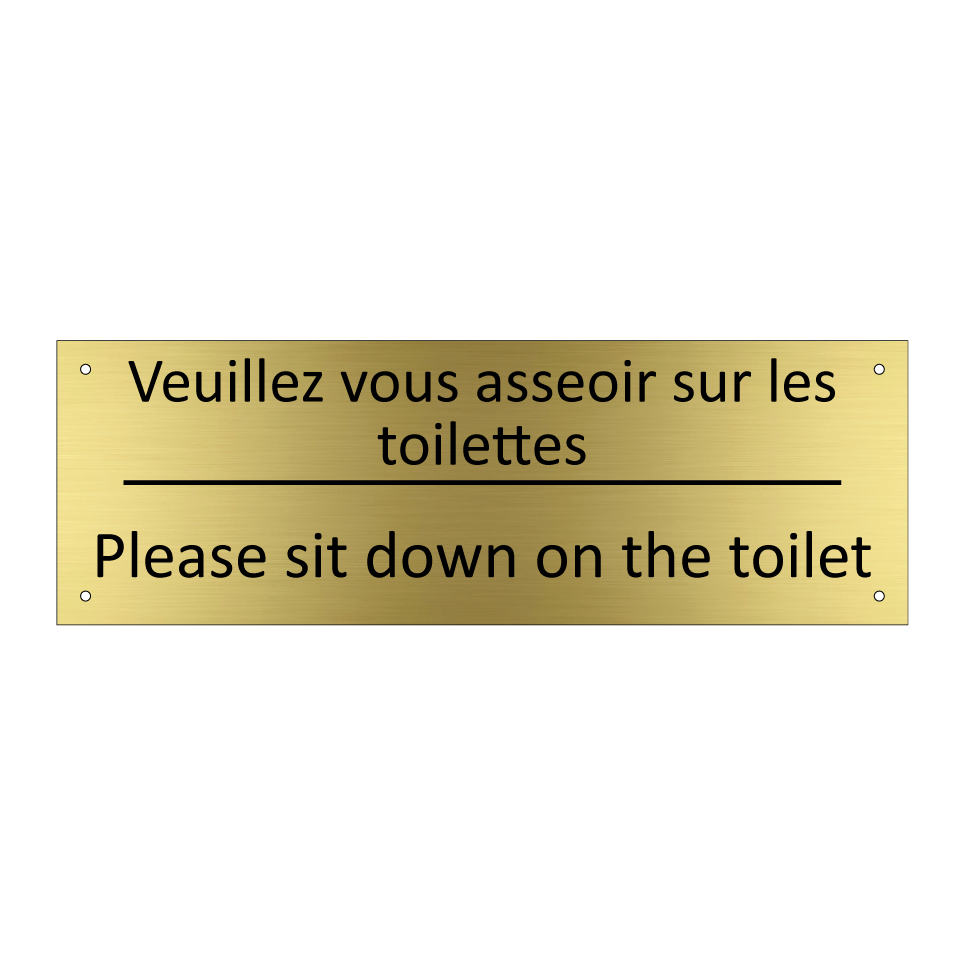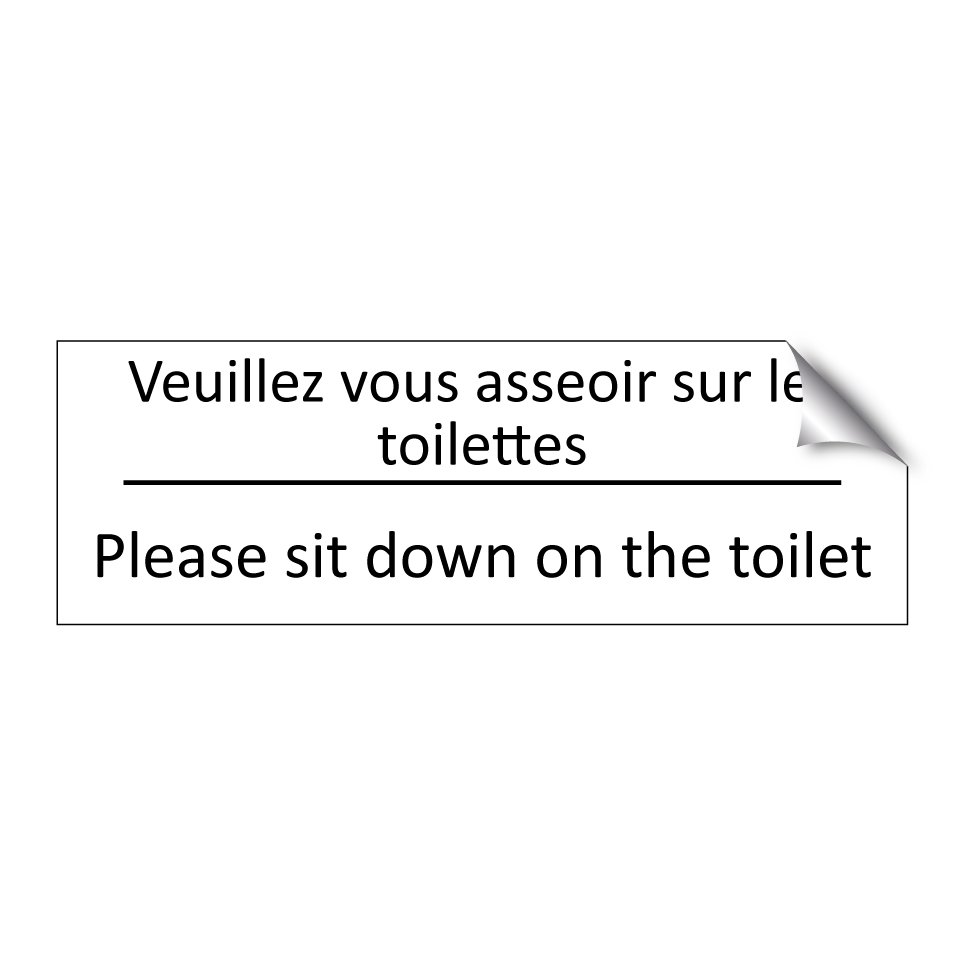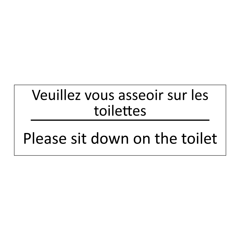 Panneau d'information avec le texte Veuillez vous asseoir sur les toilettes|Please sit down on the toilet en français et en anglais.