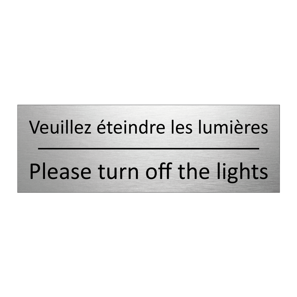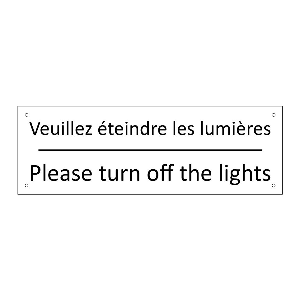 Panneau d'information avec le texte Veuillez éteindre les lumières|Please turn off the lights en français et en anglais.