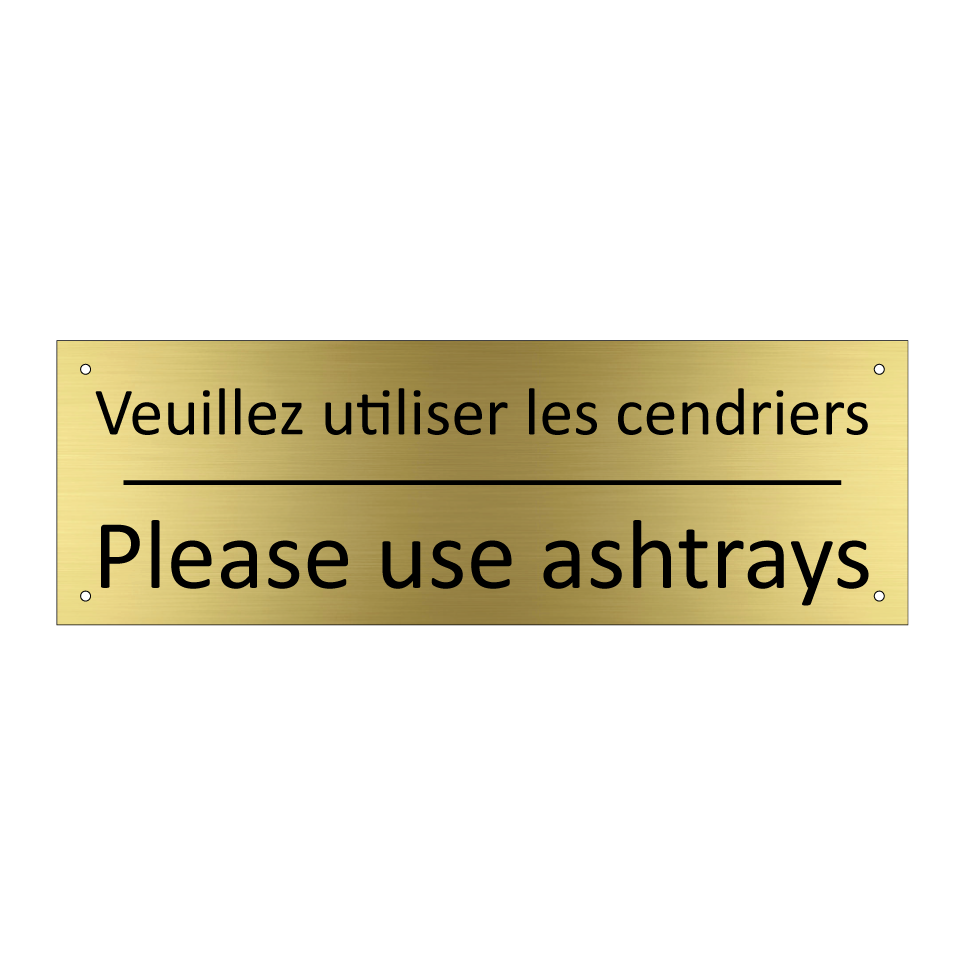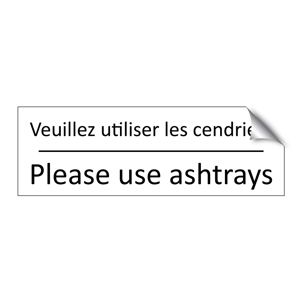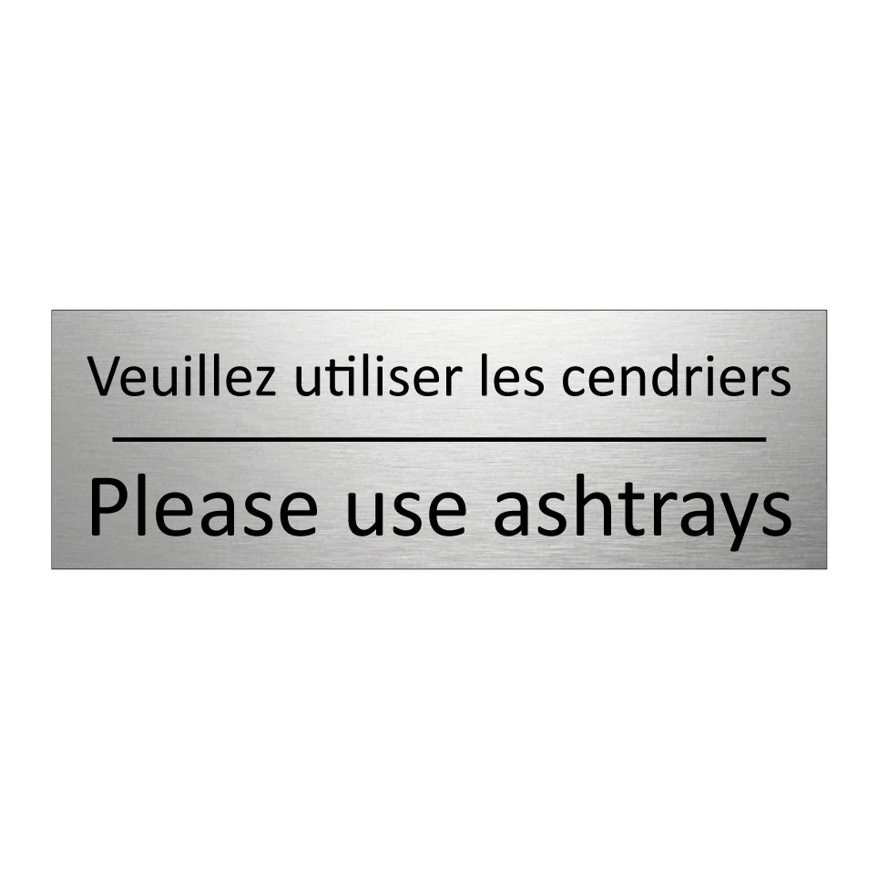 Panneau d'information avec le texte Veuillez utiliser les cendriers|Please use ashtrays en français et en anglais.