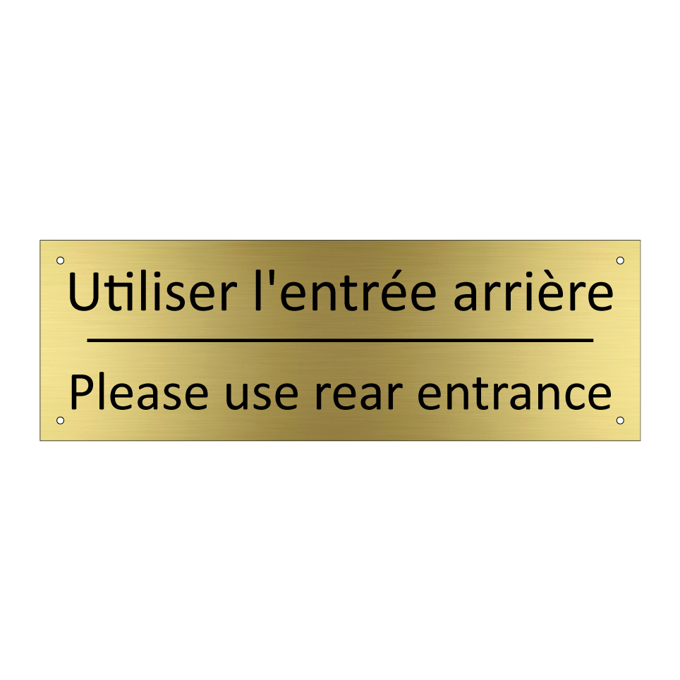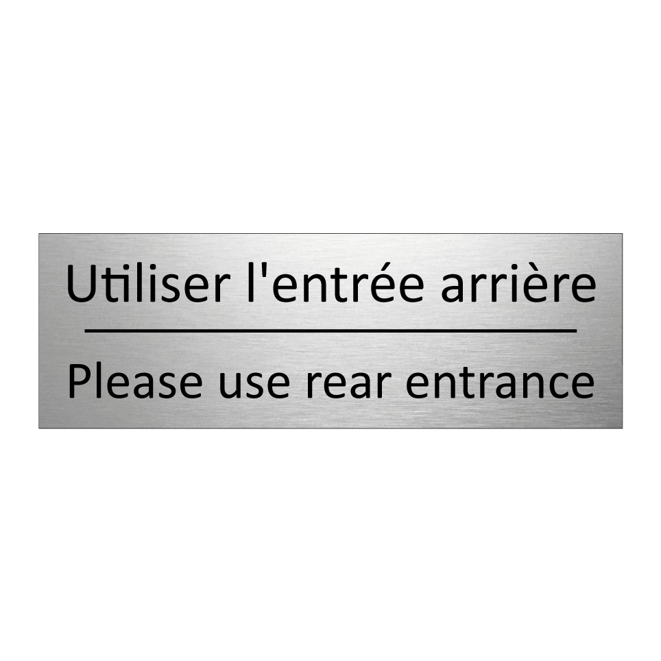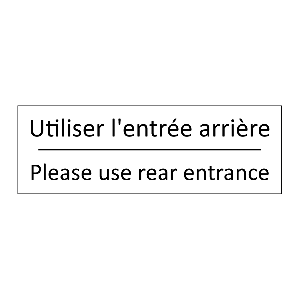 Panneau d'information avec le texte Utiliser l'entrée arrière|Please use rear entrance en français et en anglais.