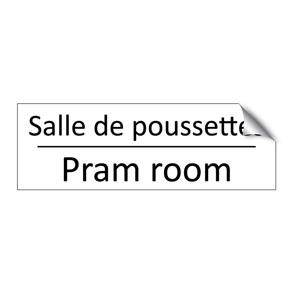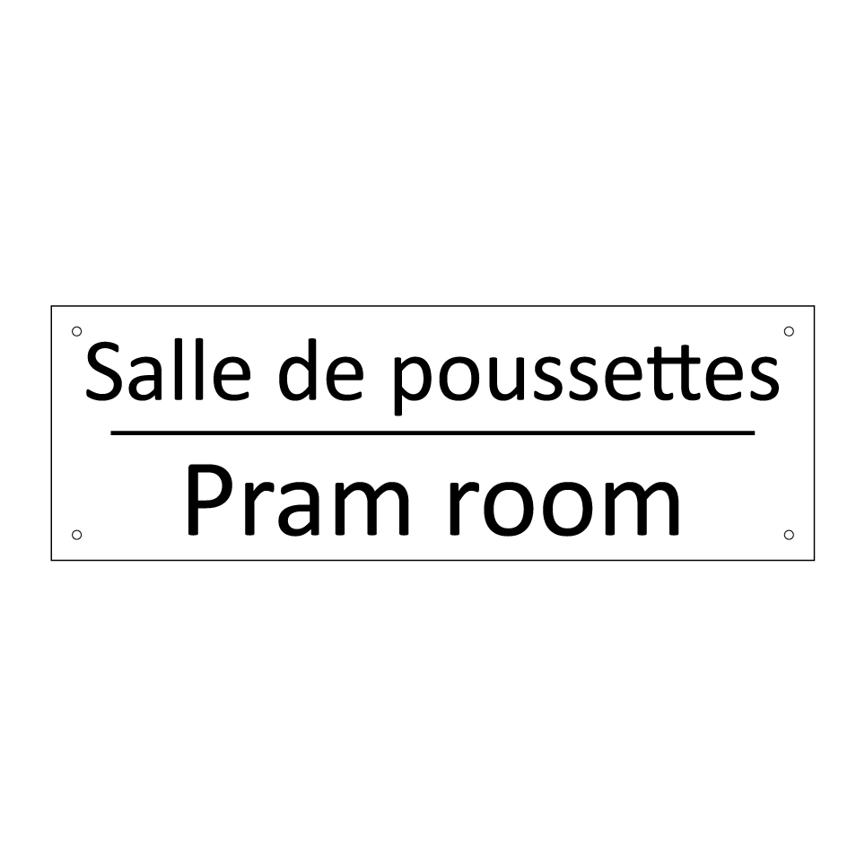 Panneau d'information avec le texte Salle de poussettes|Pram room en français et en anglais.