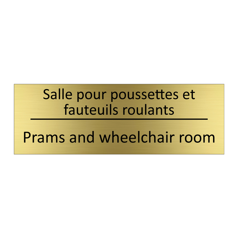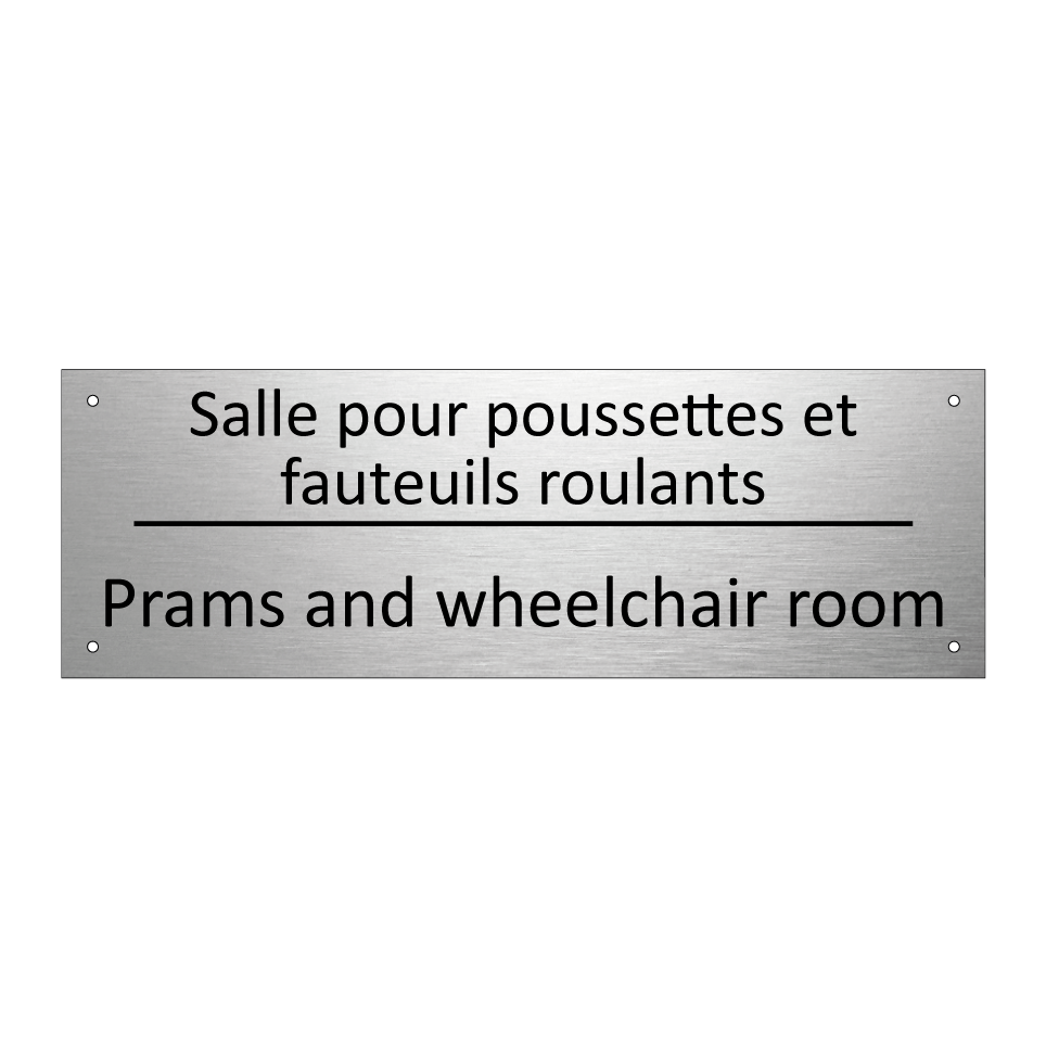Panneau d'information avec le texte Salle pour poussettes et fauteuils roulants|Prams and wheelchair room en français et en anglais.