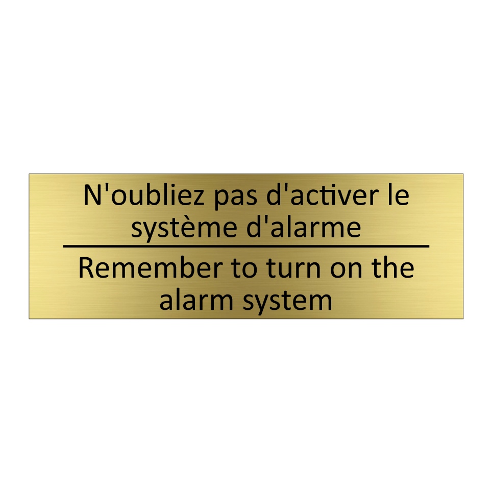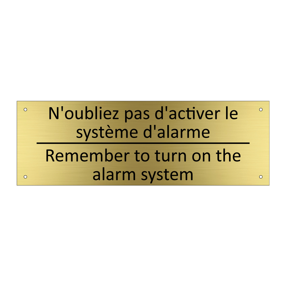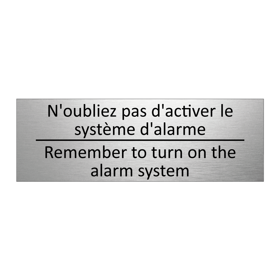 Panneau d'information avec le texte N'oubliez pas d'activer le système d'alarme|Remember to turn on the alarm system en français et en anglais.