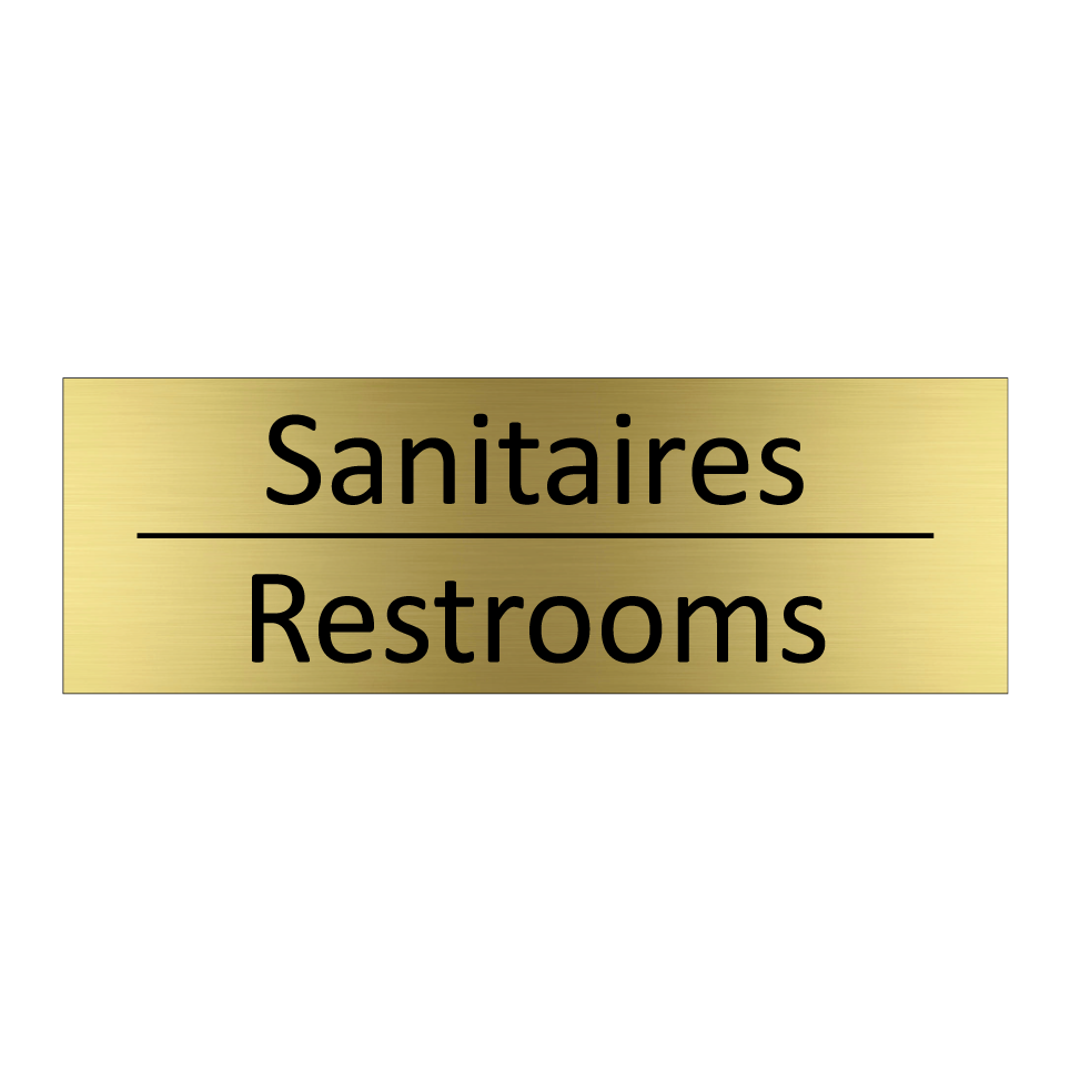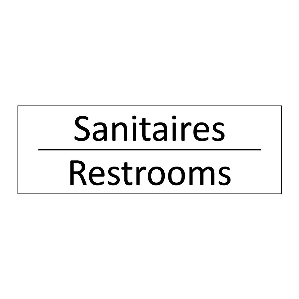 Panneau d'information avec le texte Sanitaires|Restrooms en français et en anglais.
