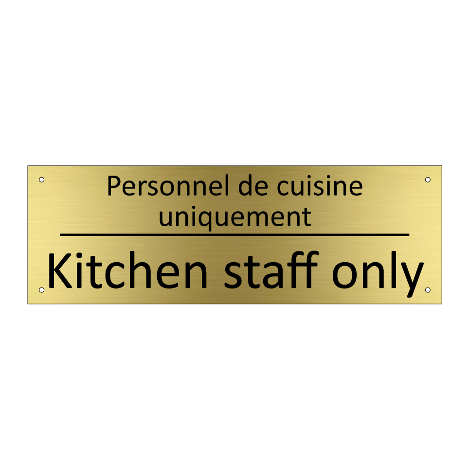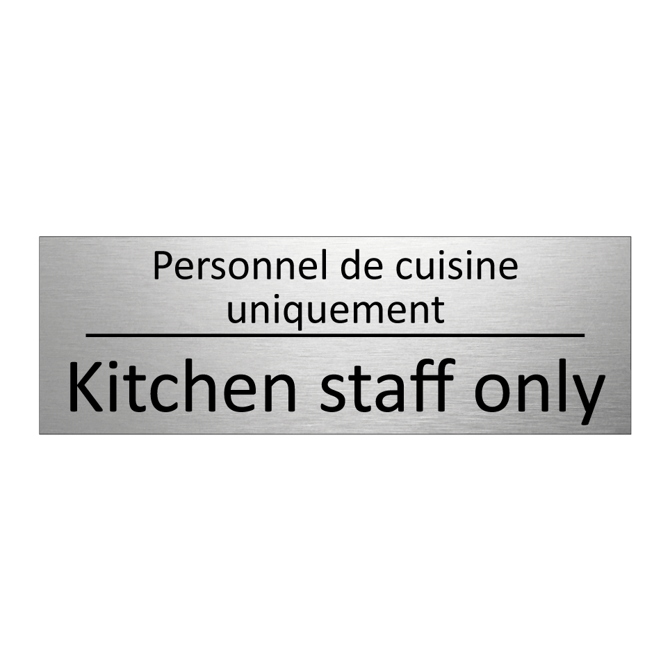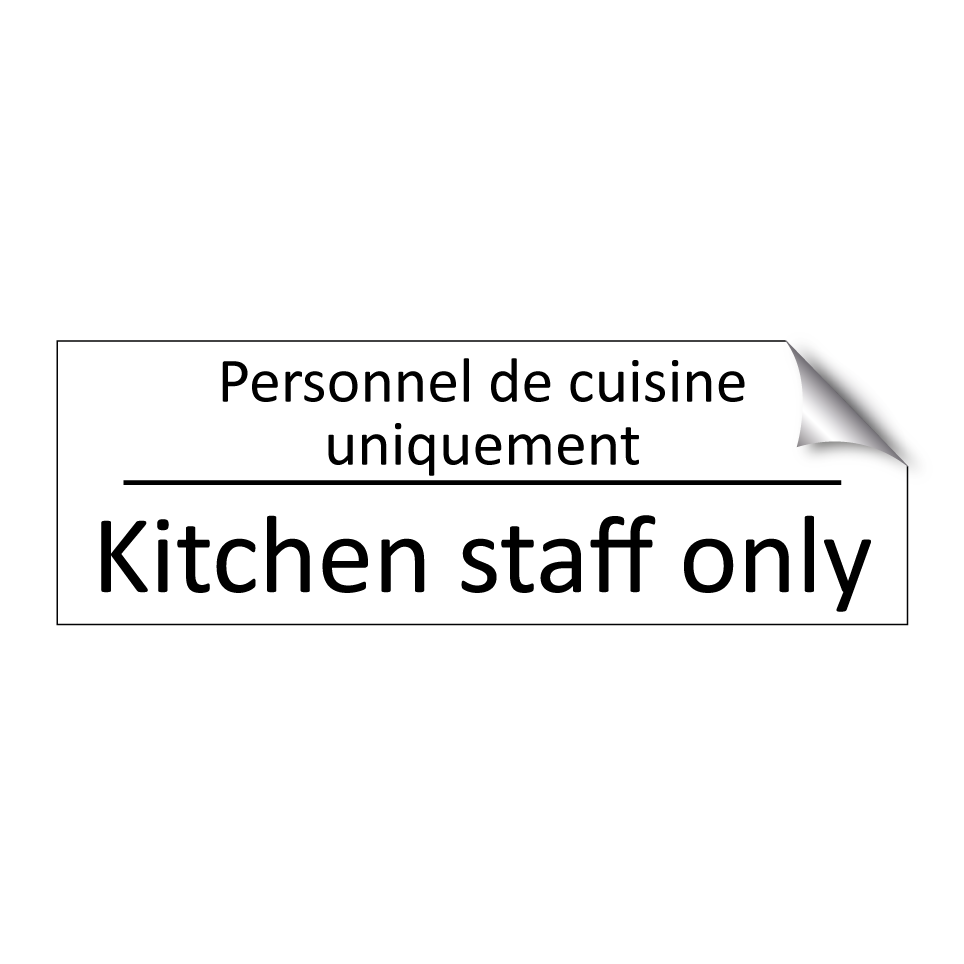 Panneau d'information avec le texte Personnel de cuisine uniquement|Kitchen staff only en français et en anglais.