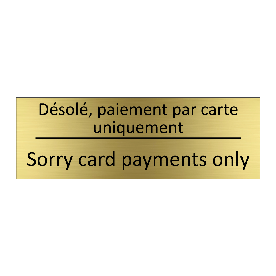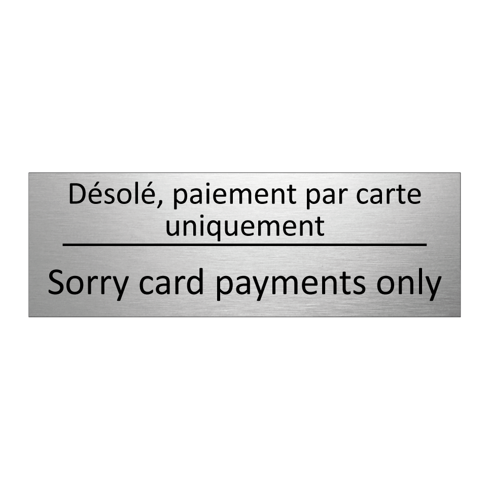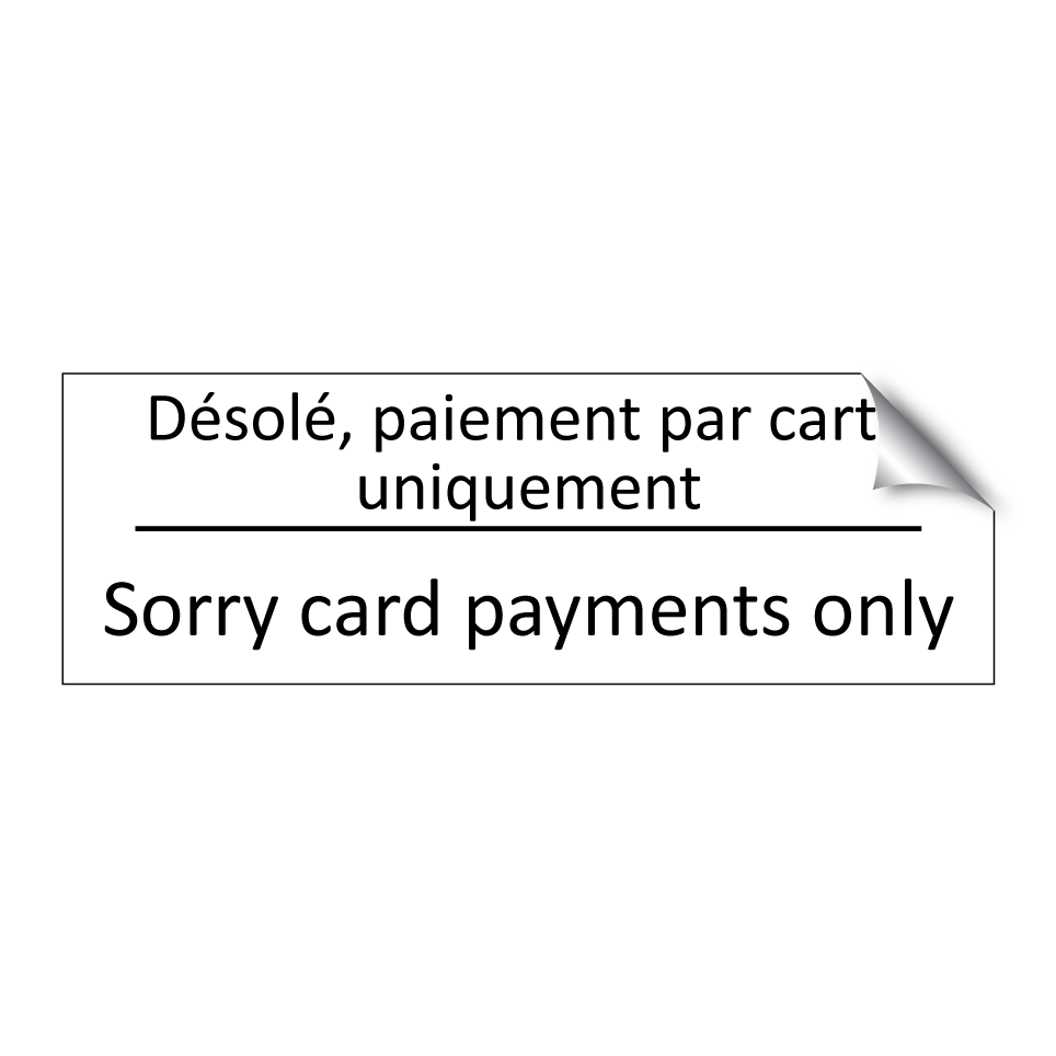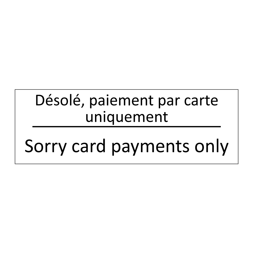 Panneau d'information avec le texte Désolé, paiement par carte uniquement|Sorry card payments only en français et en anglais.