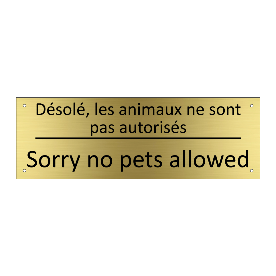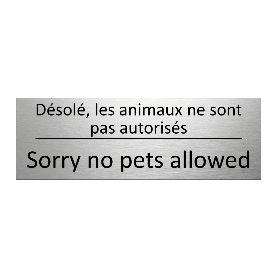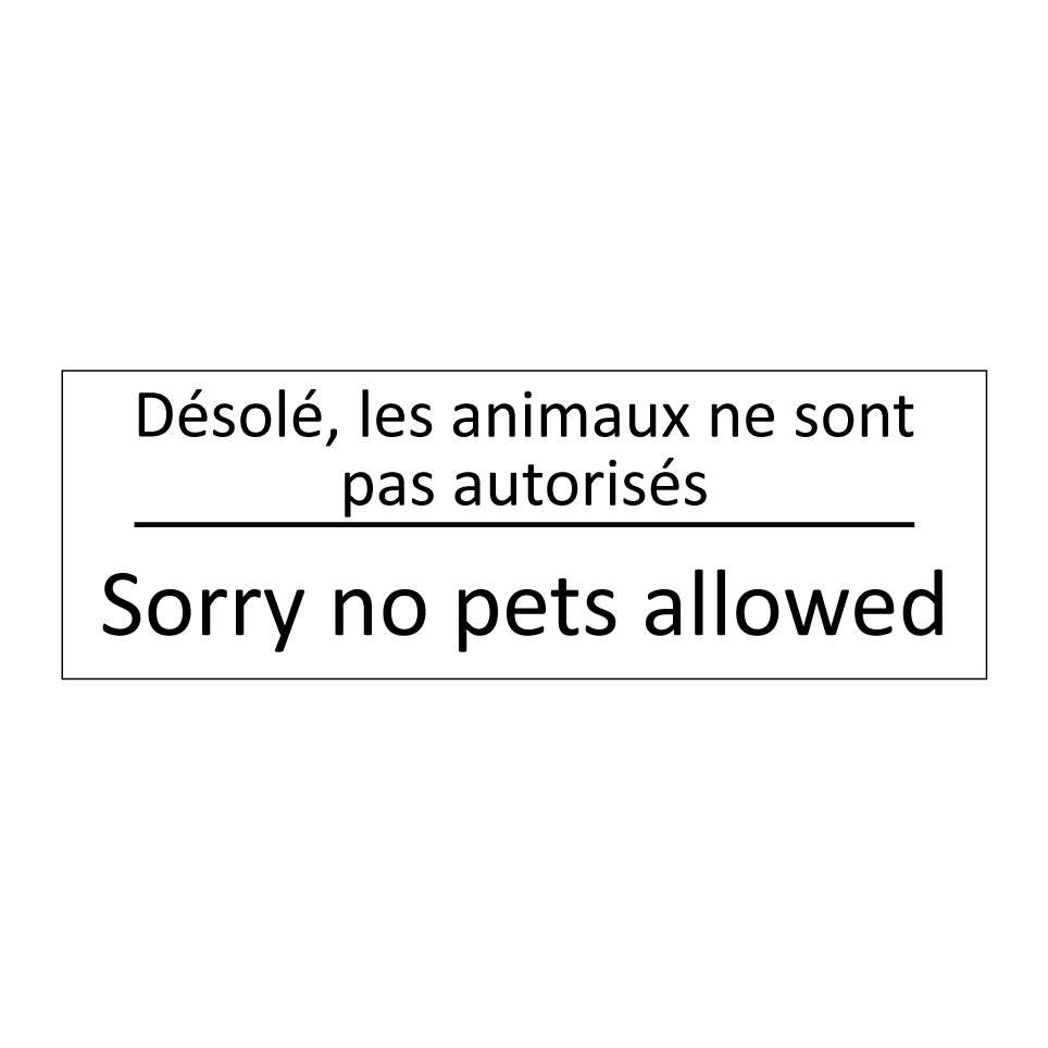 Panneau d'information avec le texte Désolé, les animaux ne sont pas autorisés|Sorry no pets allowed en français et en anglais.