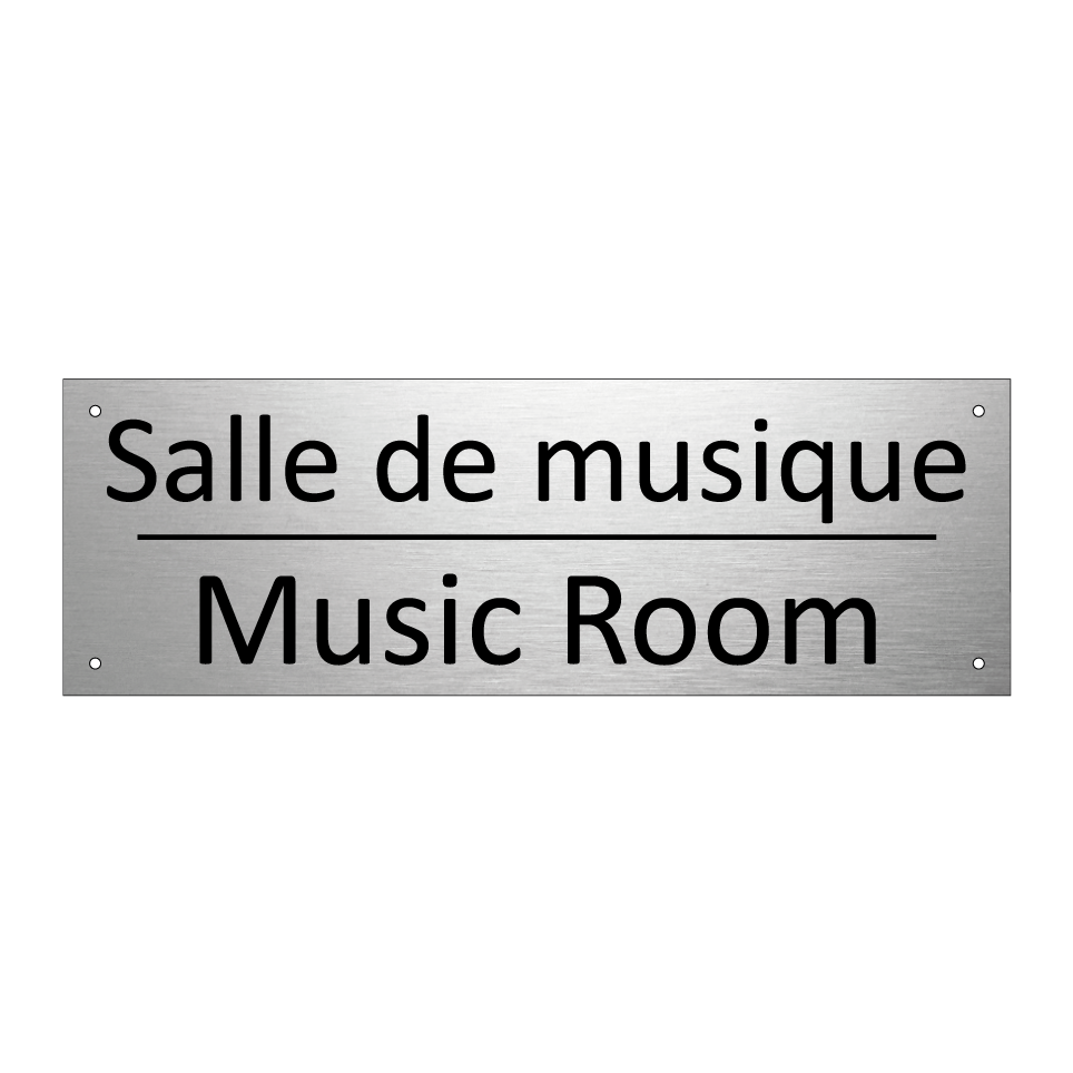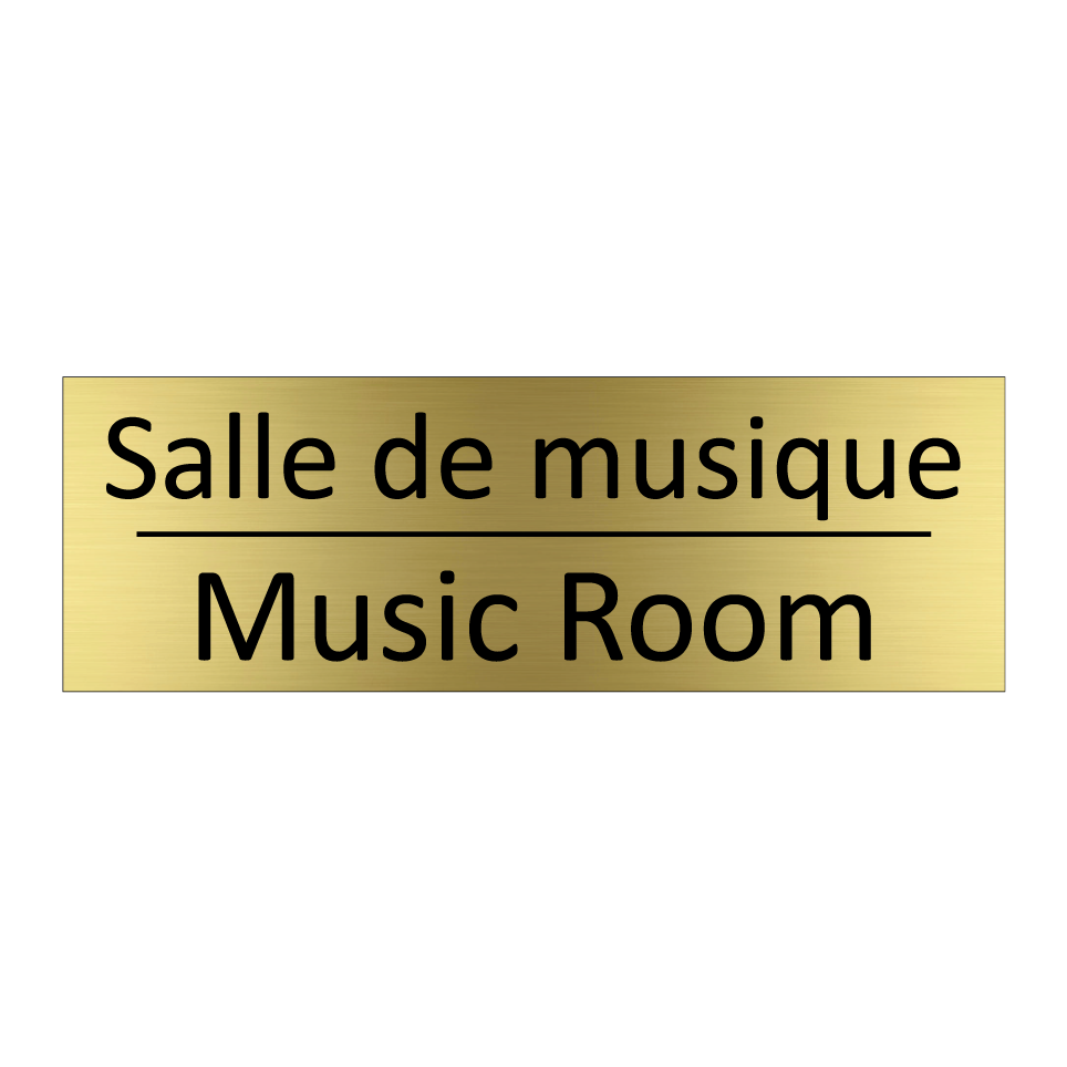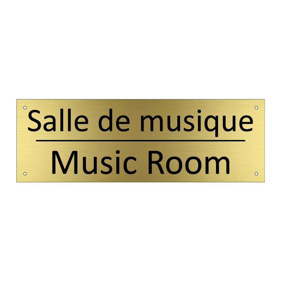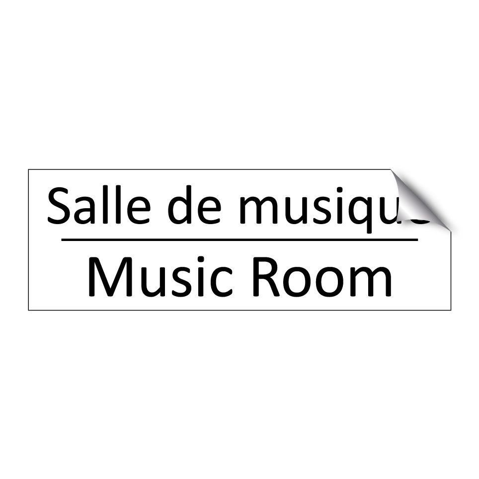 Panneau d'information avec le texte Salle de musique|Music Room en français et en anglais.