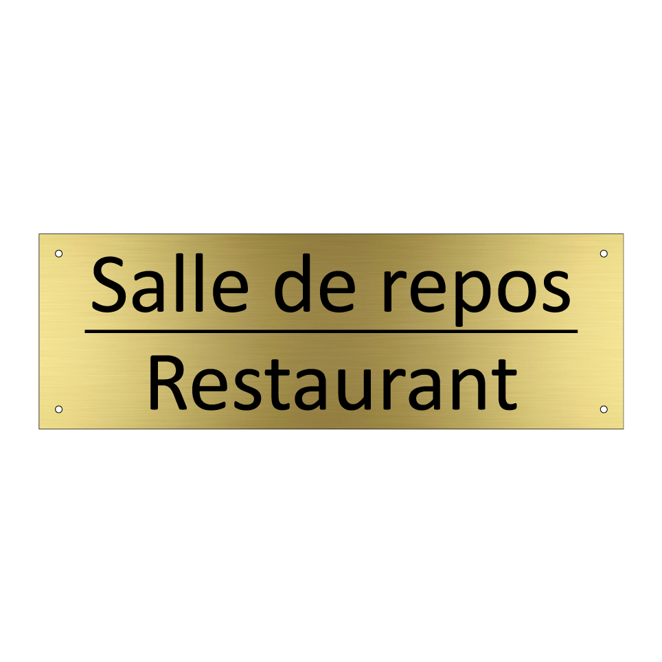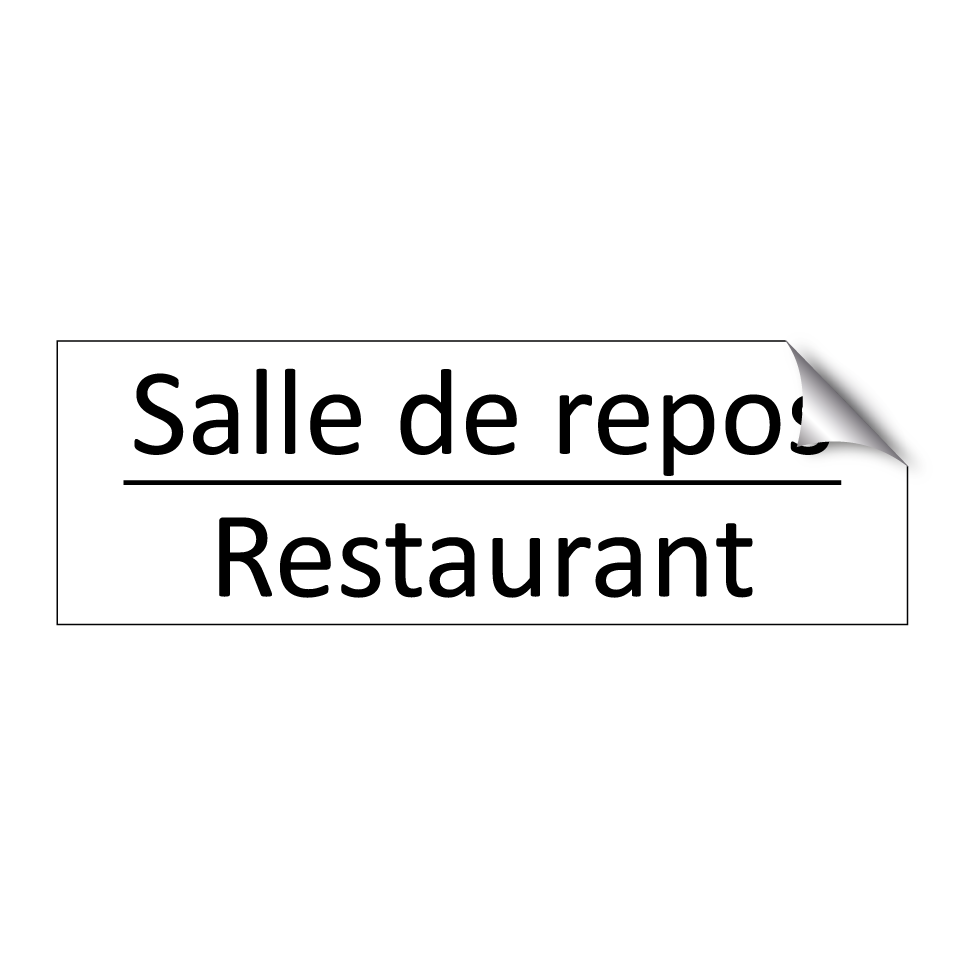 Panneau d'information avec le texte Salle de repos|Restaurant en français et en anglais.