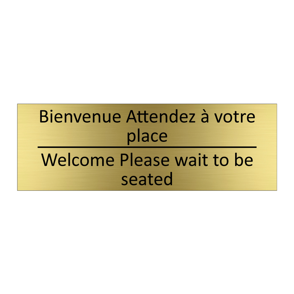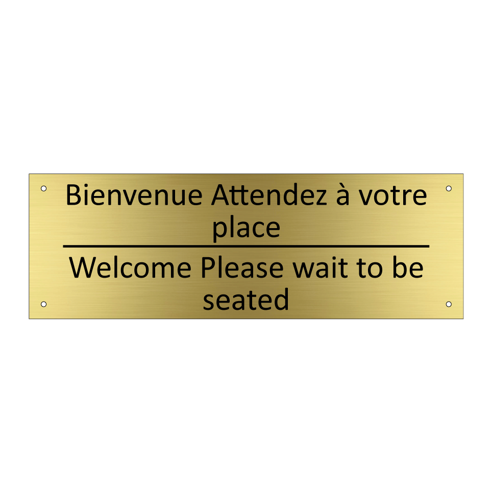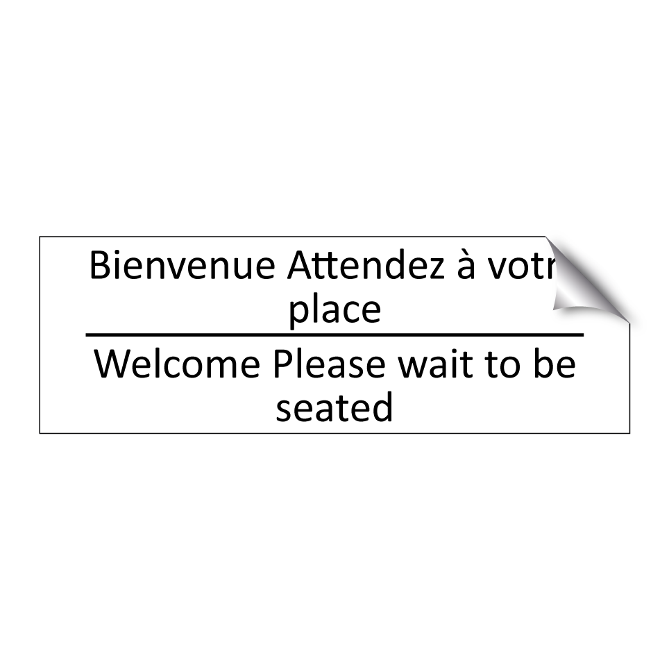 Panneau d'information avec le texte Bienvenue Attendez à votre place|Welcome Please wait to be seated en français et en anglais.