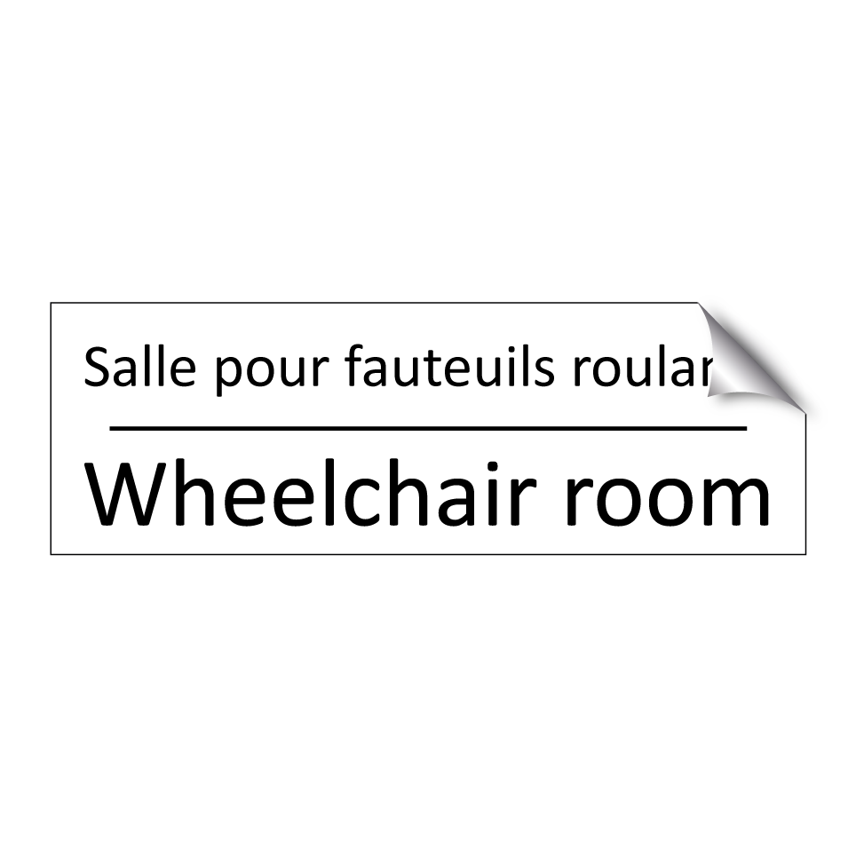 Panneau d'information avec le texte Salle pour fauteuils roulants|Wheelchair room en français et en anglais.