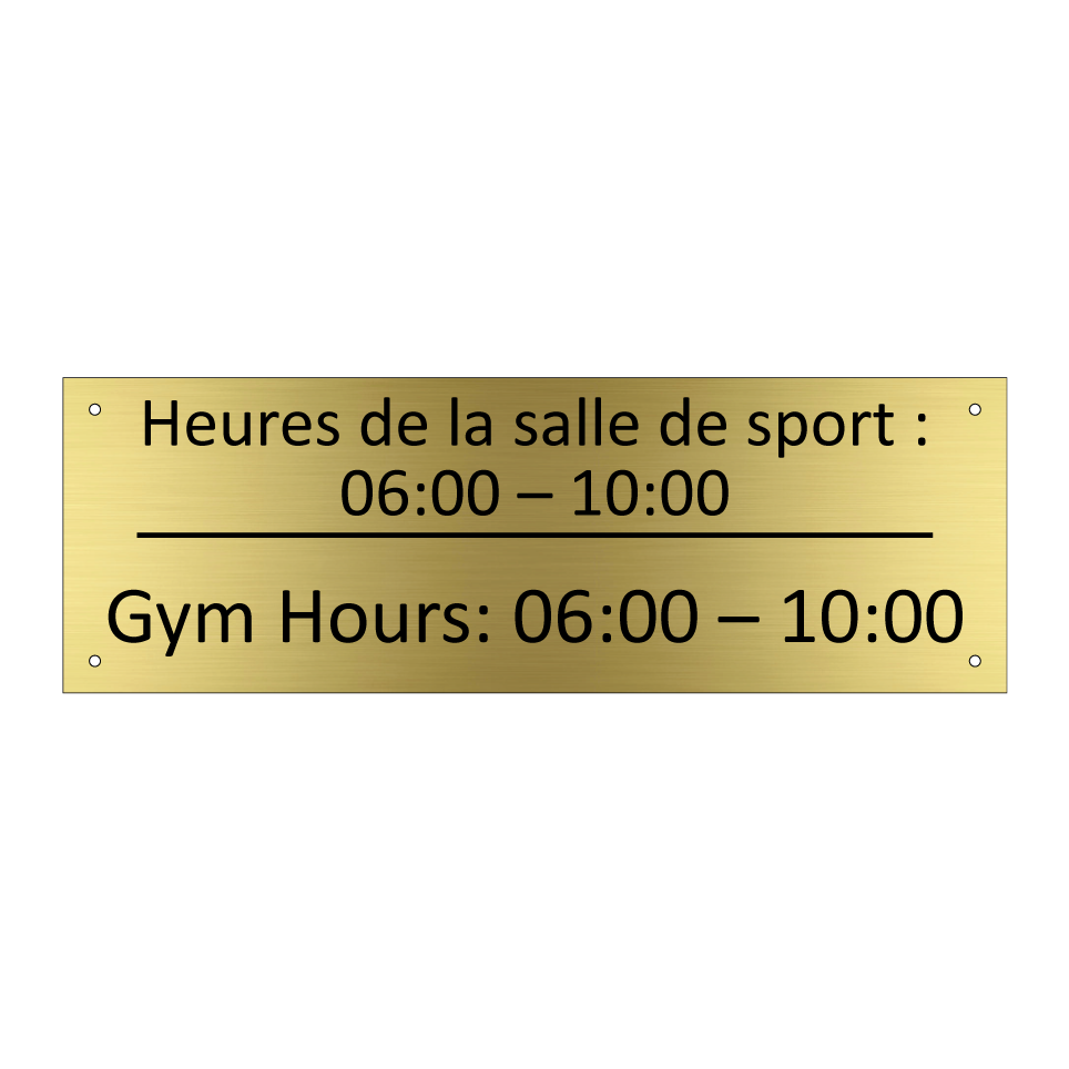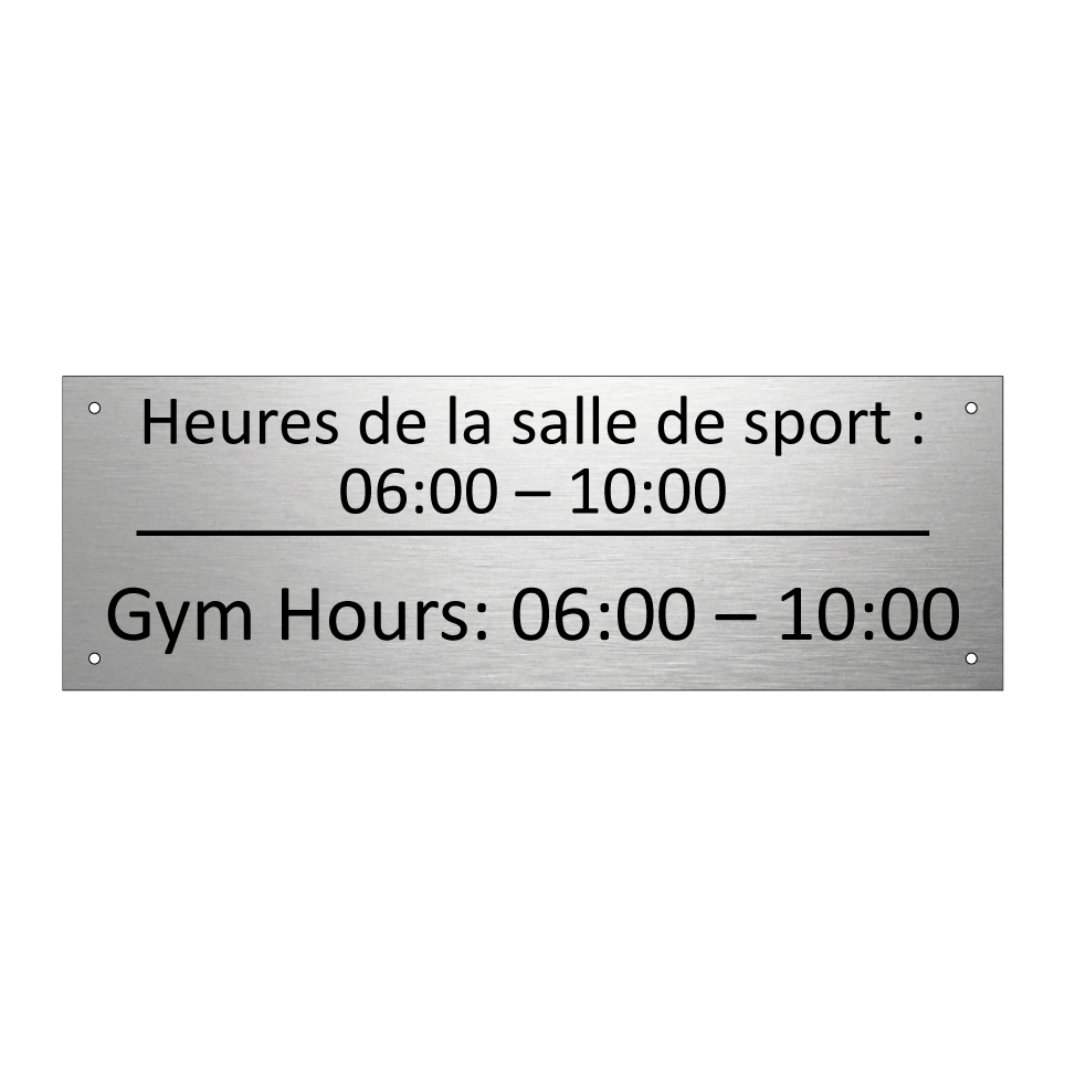 Panneau d'information avec le texte Heures de la salle de sport : 06:00 – 10:00|Gym Hours: 06:00 – 10:00 en français et en anglais.