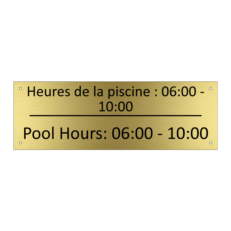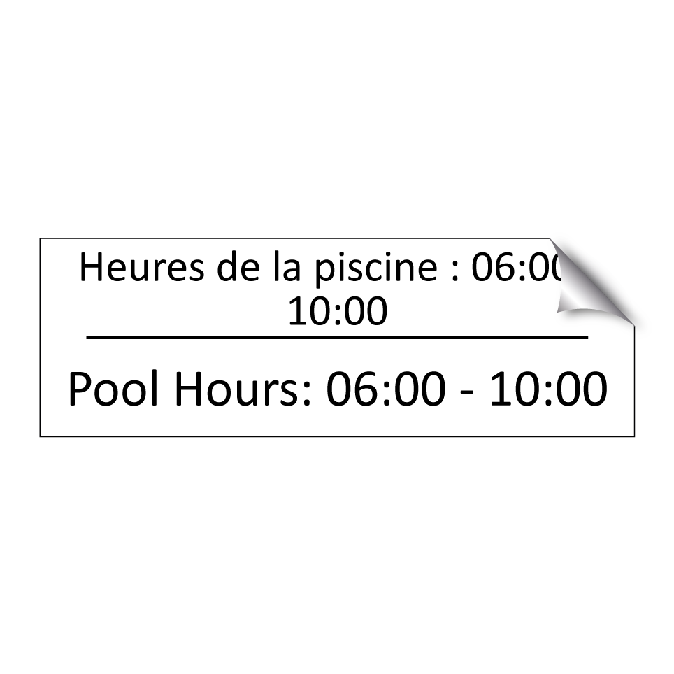 Panneau d'information avec le texte Heures de la piscine : 06:00 - 10:00|Pool Hours: 06:00 - 10:00 en français et en anglais.