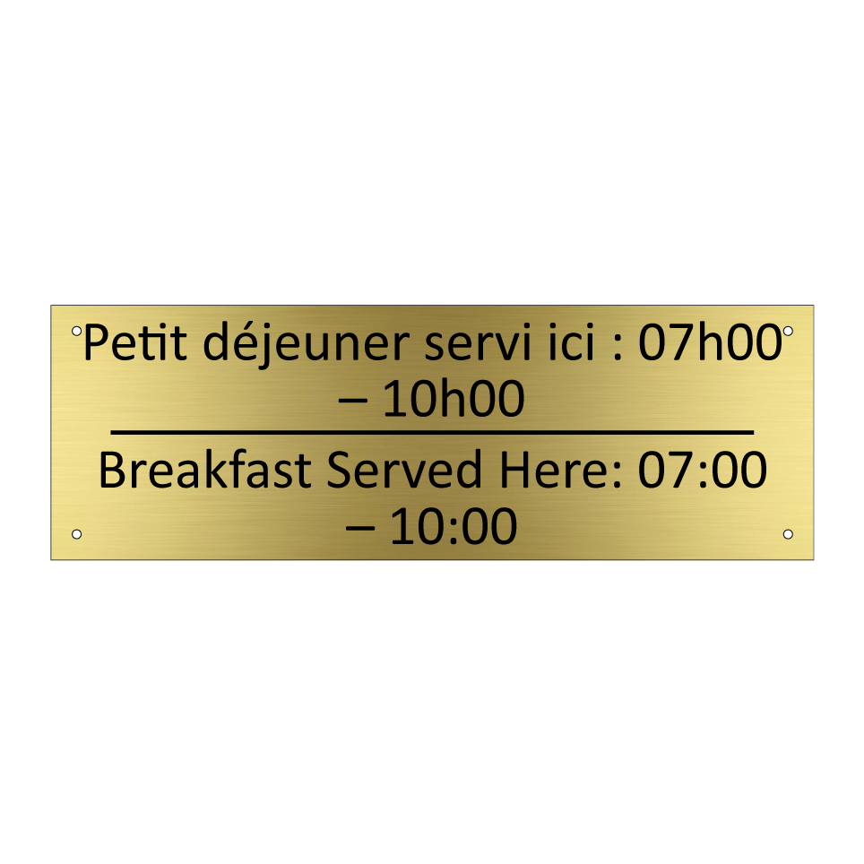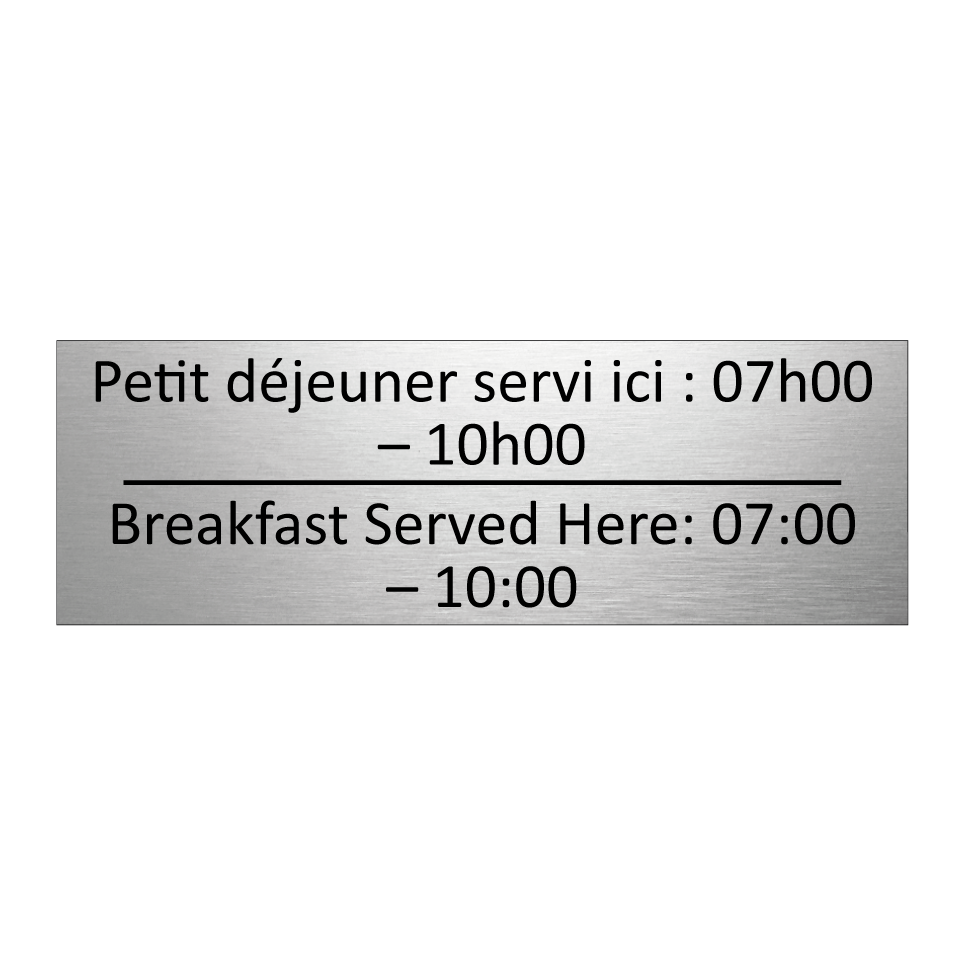 Panneau d'information avec le texte Petit déjeuner servi ici : 07h00 – 10h00|Breakfast Served Here: 07:00 – 10:00 en français et en anglais.