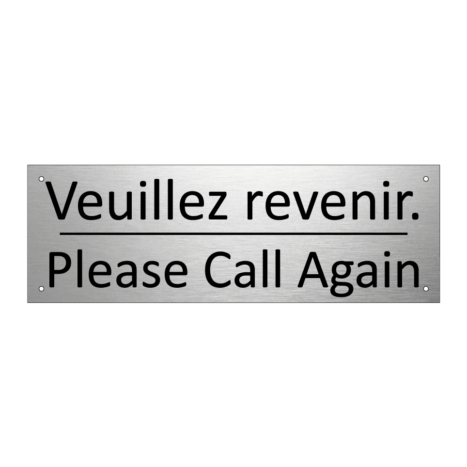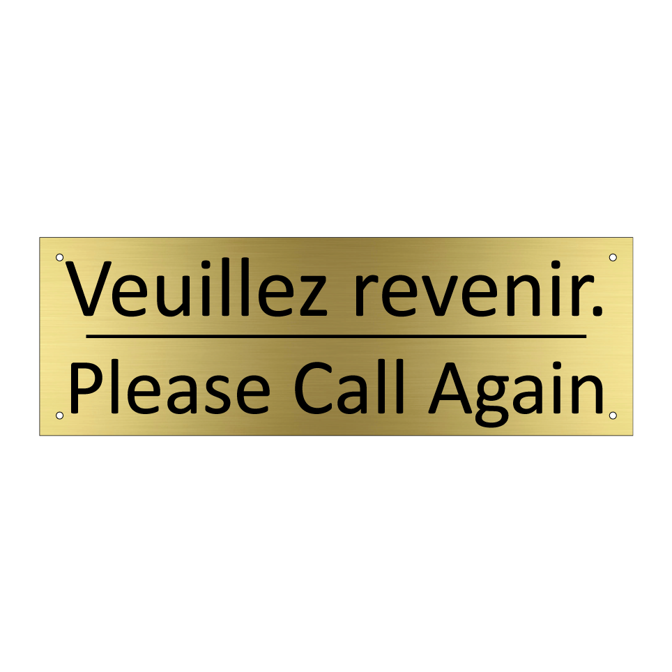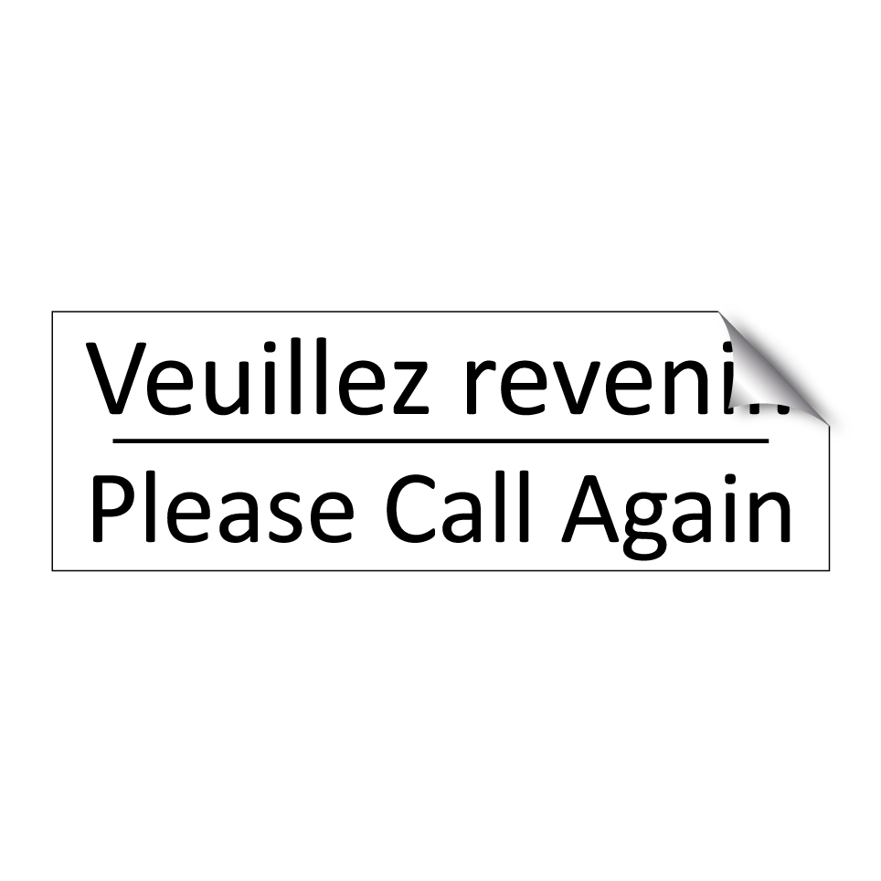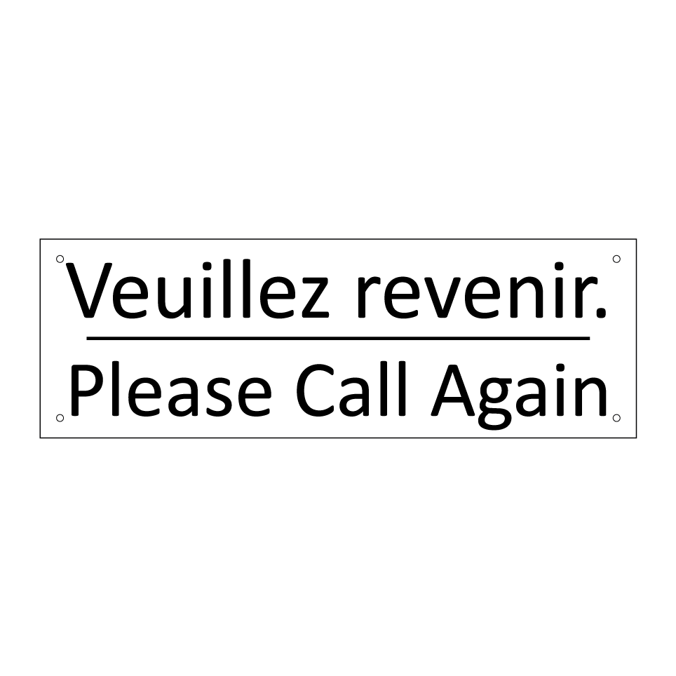 Panneau d'information avec le texte Veuillez revenir.|Please Call Again en français et en anglais.