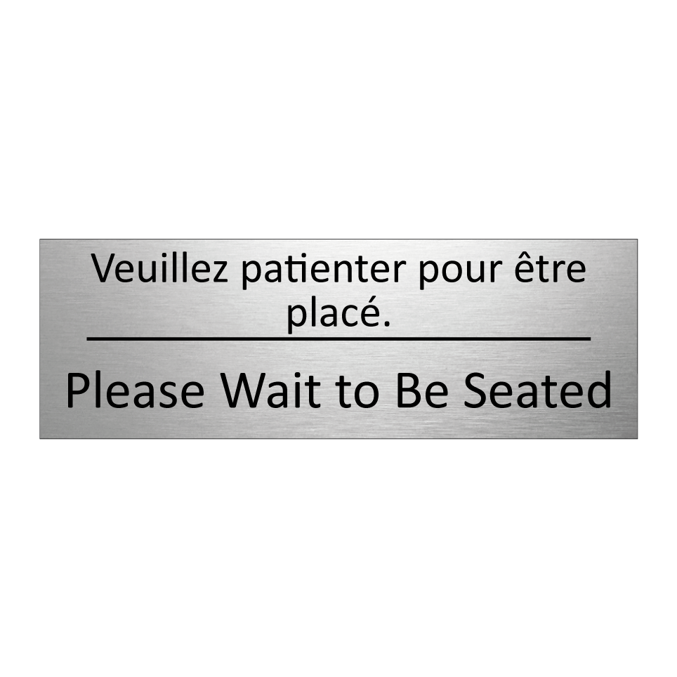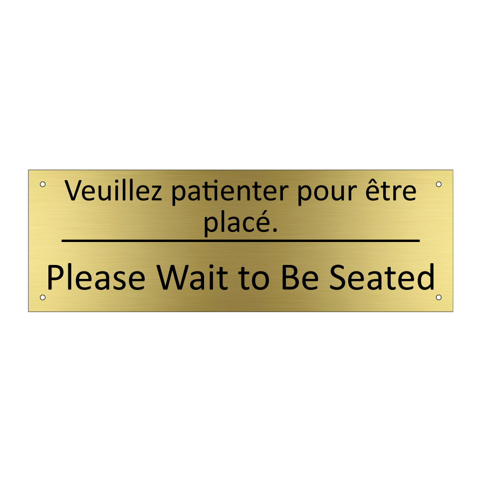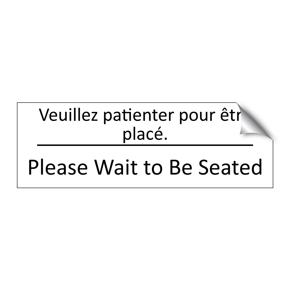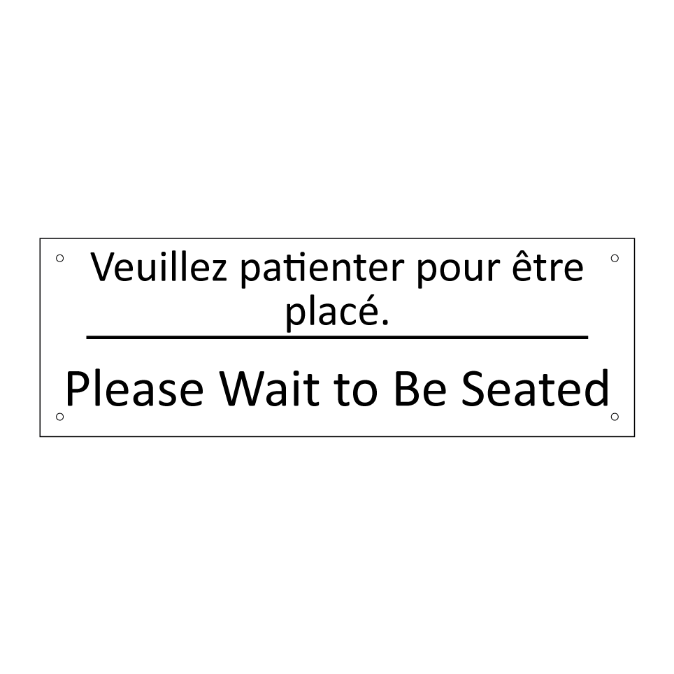 Panneau d'information avec le texte Veuillez patienter pour être placé.|Please Wait to Be Seated en français et en anglais.