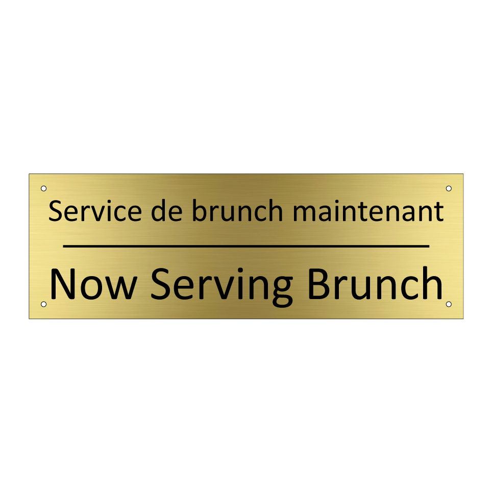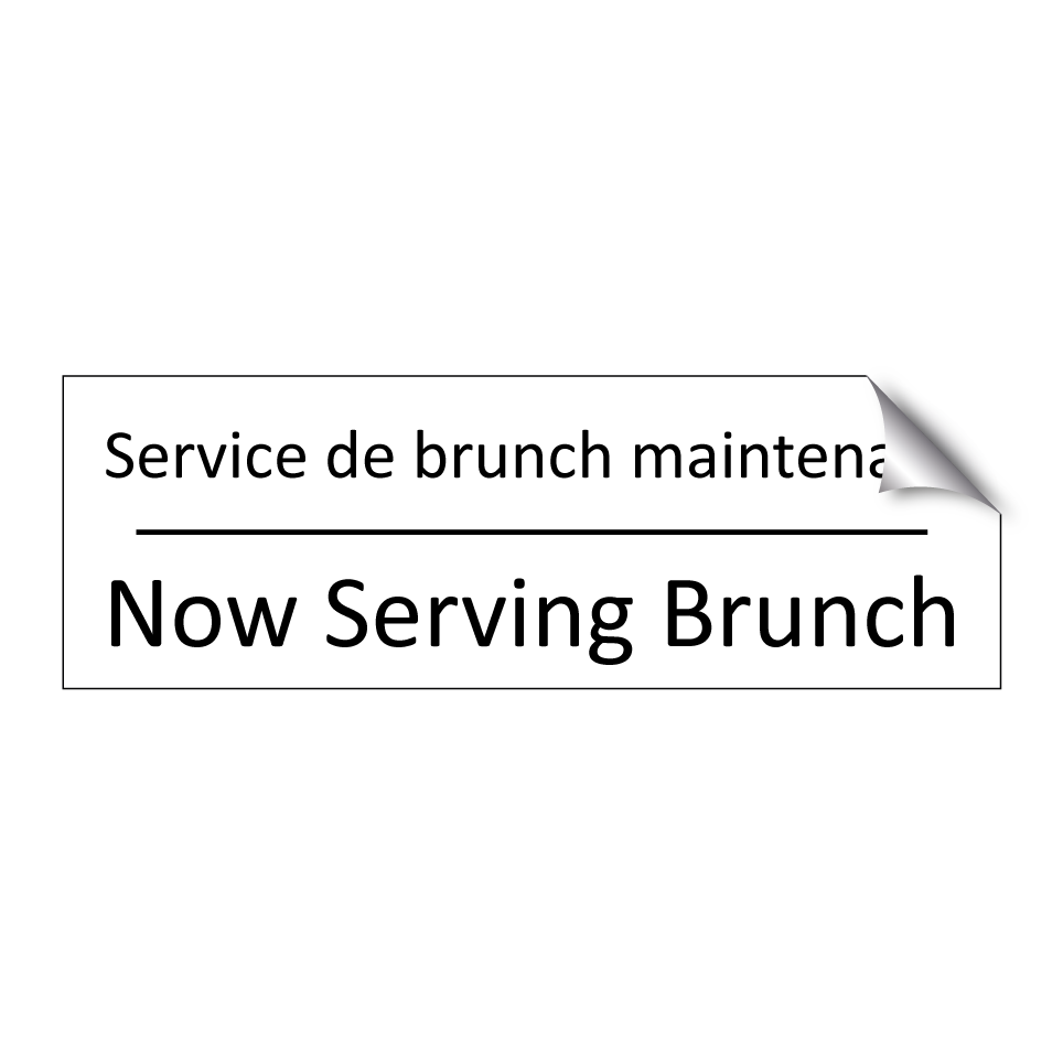 Panneau d'information avec le texte Service de brunch maintenant|Now Serving Brunch en français et en anglais.