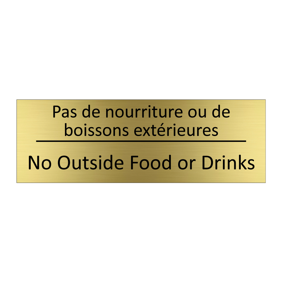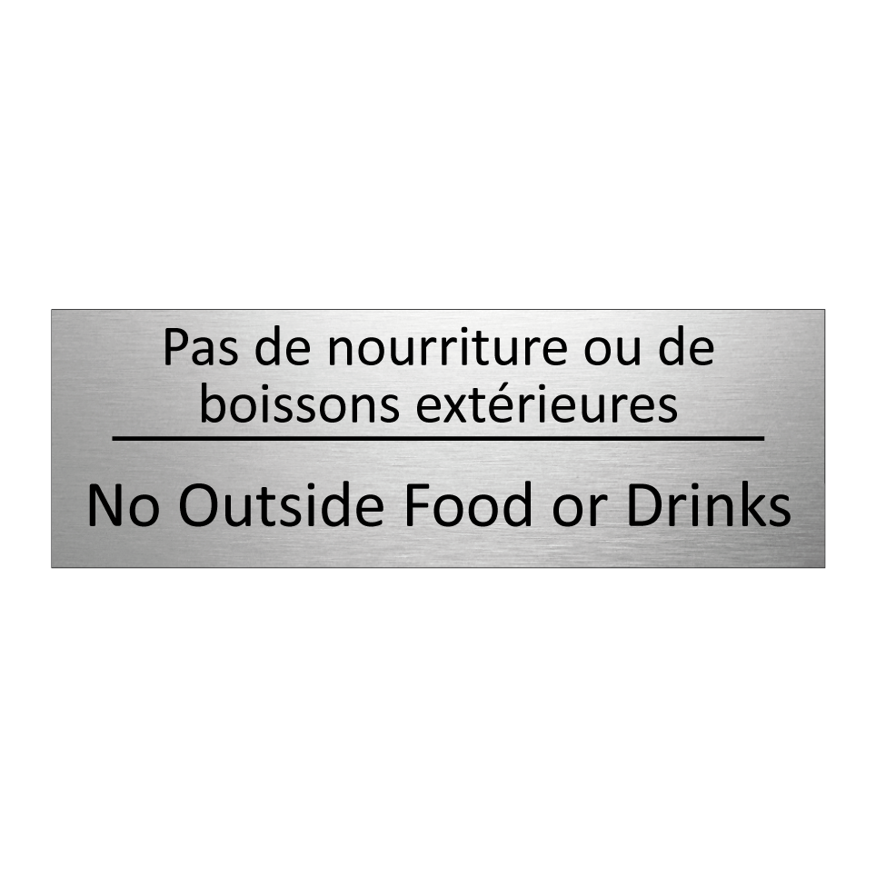 Panneau d'information avec le texte Pas de nourriture ou de boissons extérieures|No Outside Food or Drinks en français et en anglais.