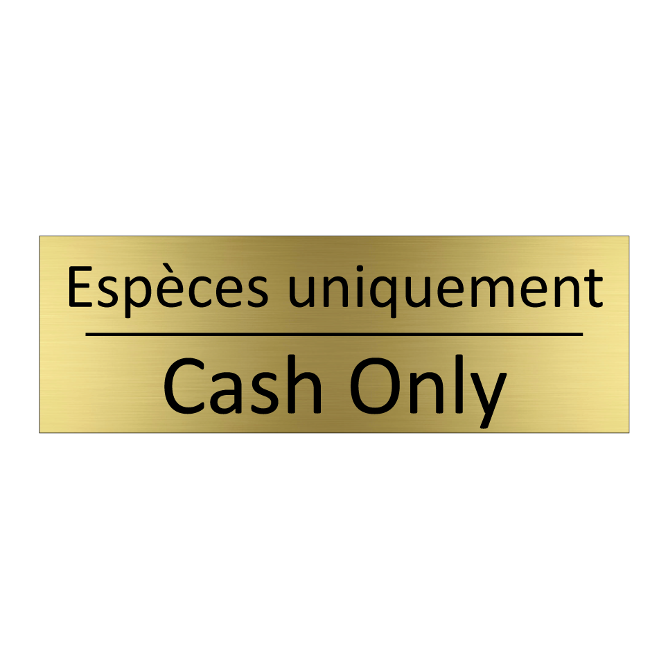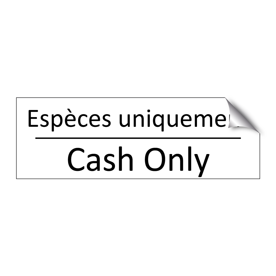 Panneau d'information avec le texte Espèces uniquement|Cash Only en français et en anglais.