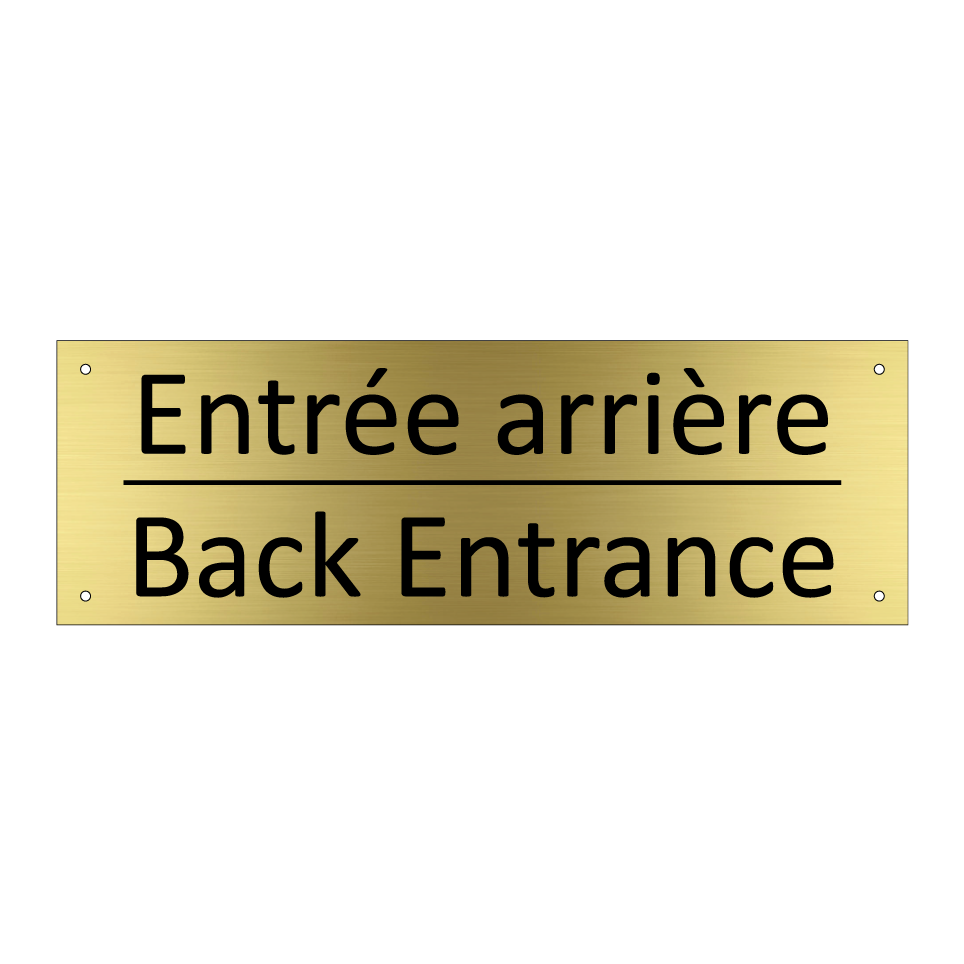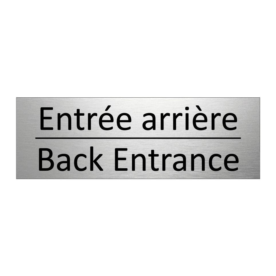Panneau d'information avec le texte Entrée arrière|Back Entrance en français et en anglais.