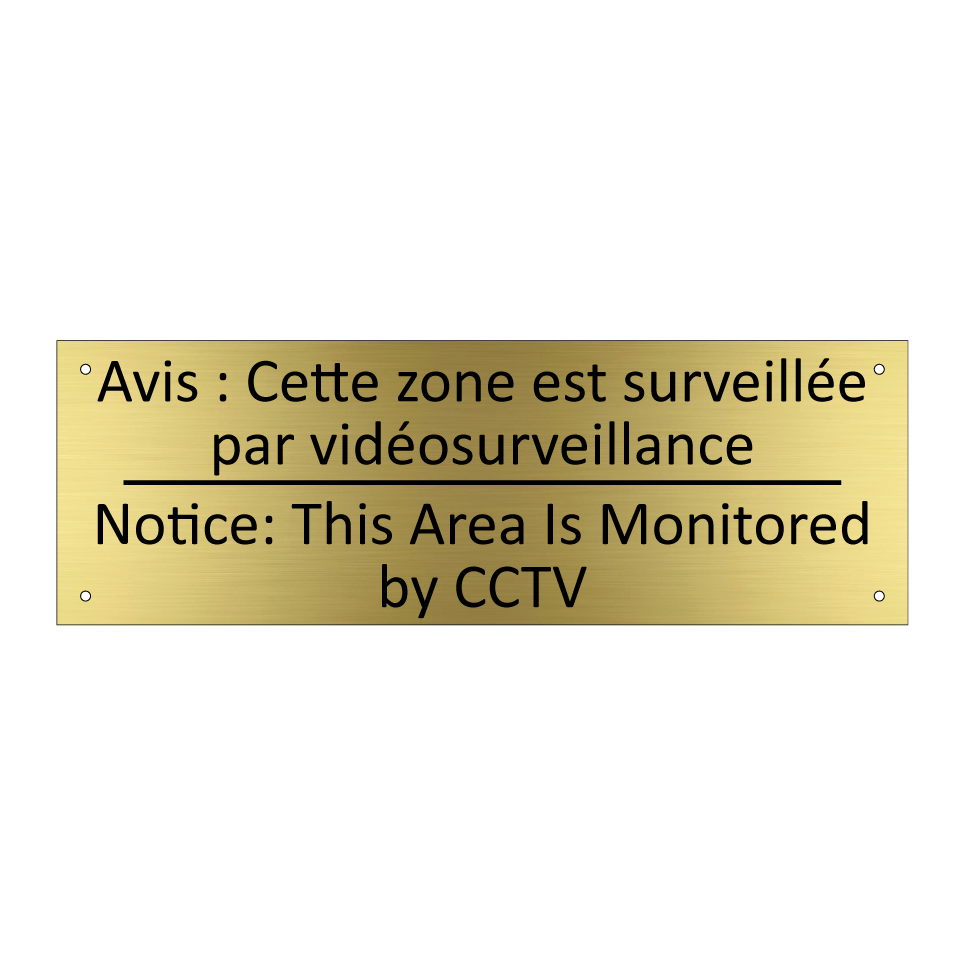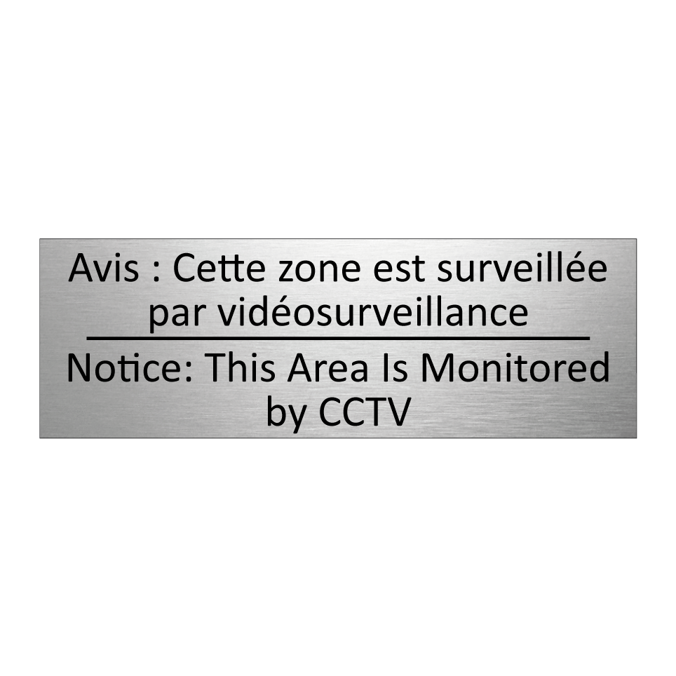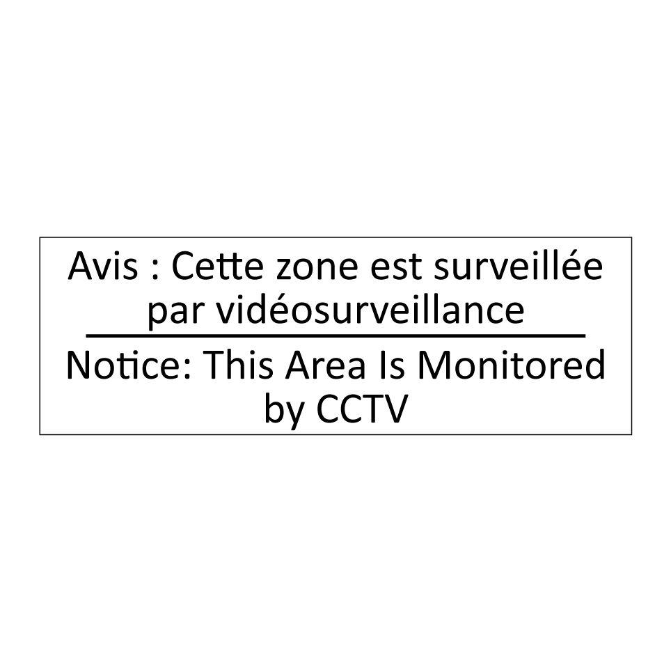 Panneau d'information avec le texte Avis : Cette zone est surveillée par vidéosurveillance|Notice: This Area Is Monitored by CCTV en français et en anglais.