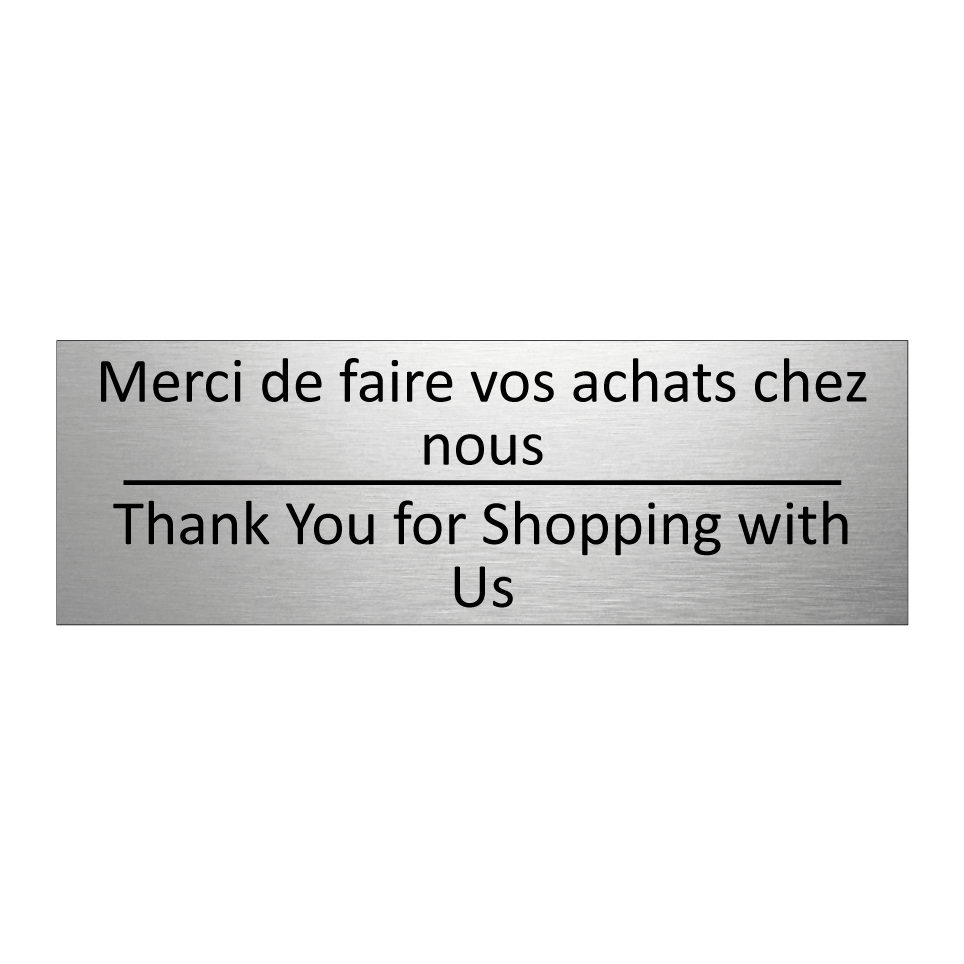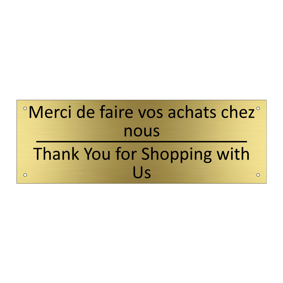 Panneau d'information avec le texte Merci de faire vos achats chez nous|Thank You for Shopping with Us en français et en anglais.
