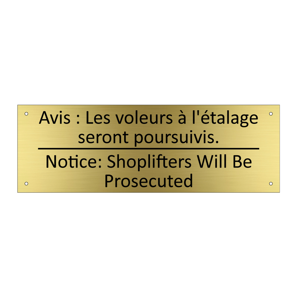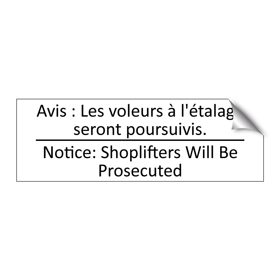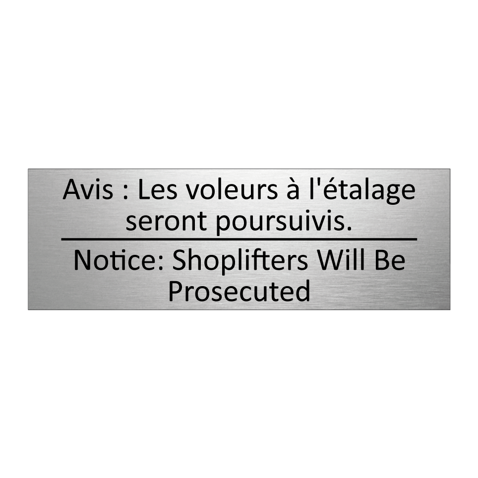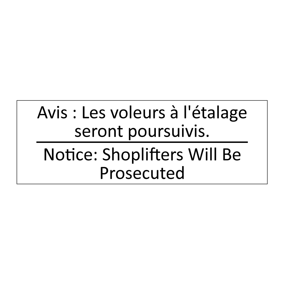 Panneau d'information avec le texte Avis : Les voleurs à l'étalage seront poursuivis.|Notice: Shoplifters Will Be Prosecuted en français et en anglais.