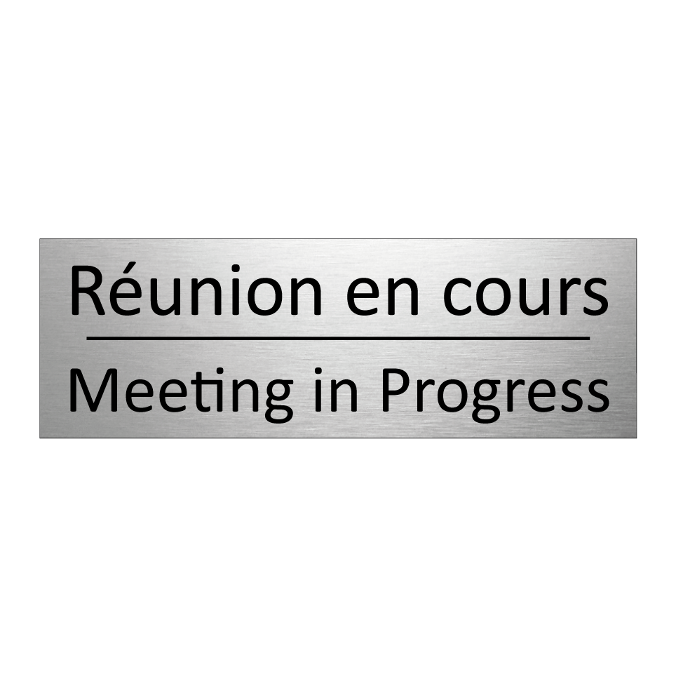 Panneau d'information avec le texte Réunion en cours|Meeting in Progress en français et en anglais.
