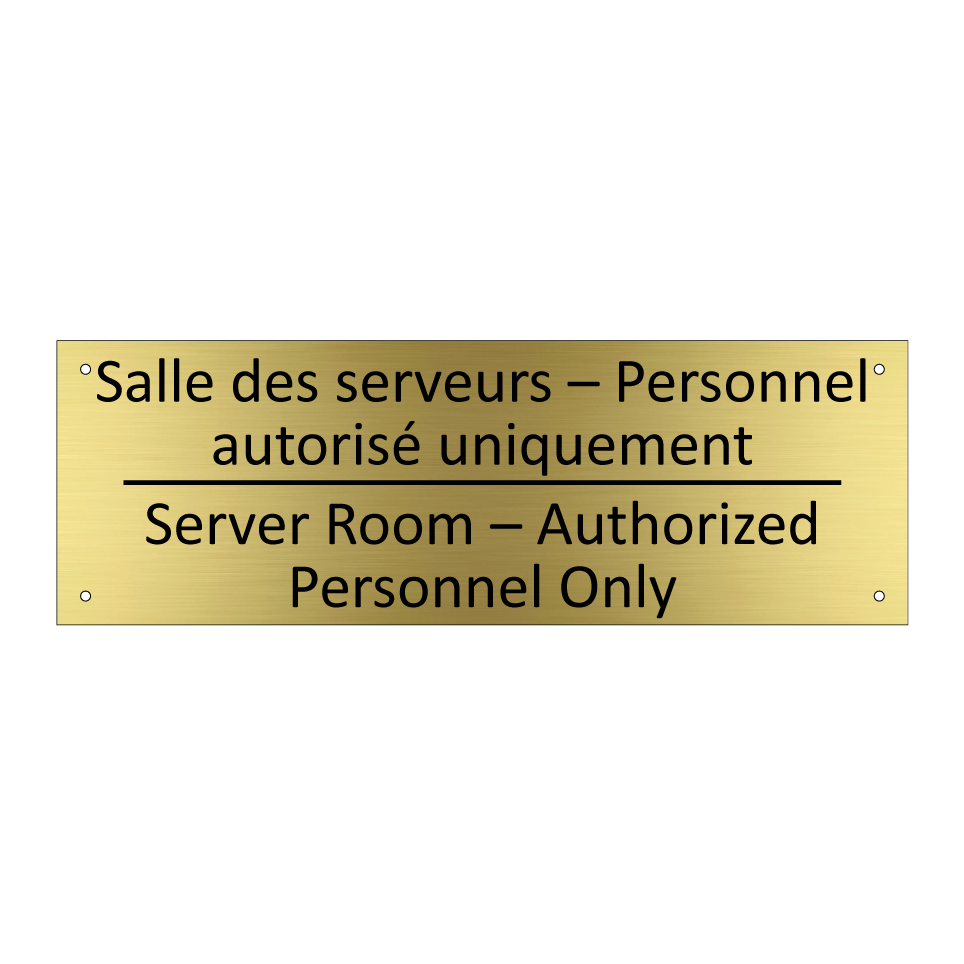 Panneau d'information avec le texte Salle des serveurs – Personnel autorisé uniquement|Server Room – Authorized Personnel Only en français et en anglais.