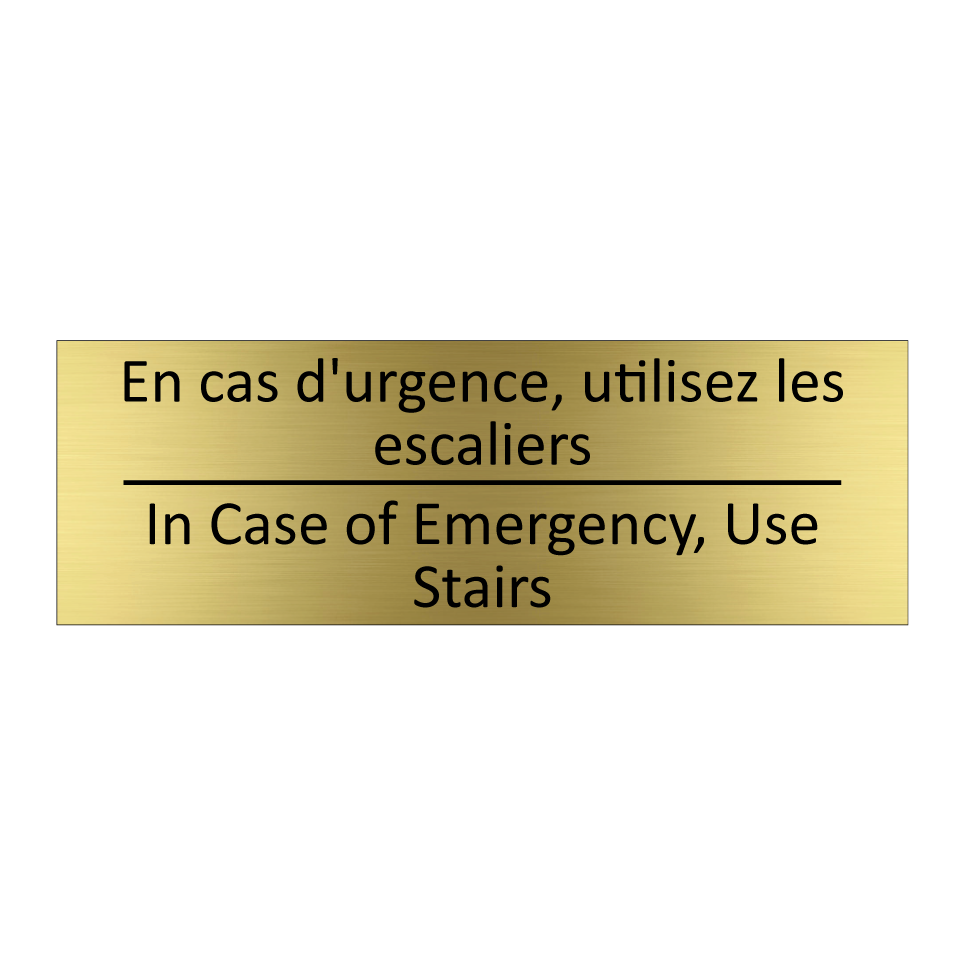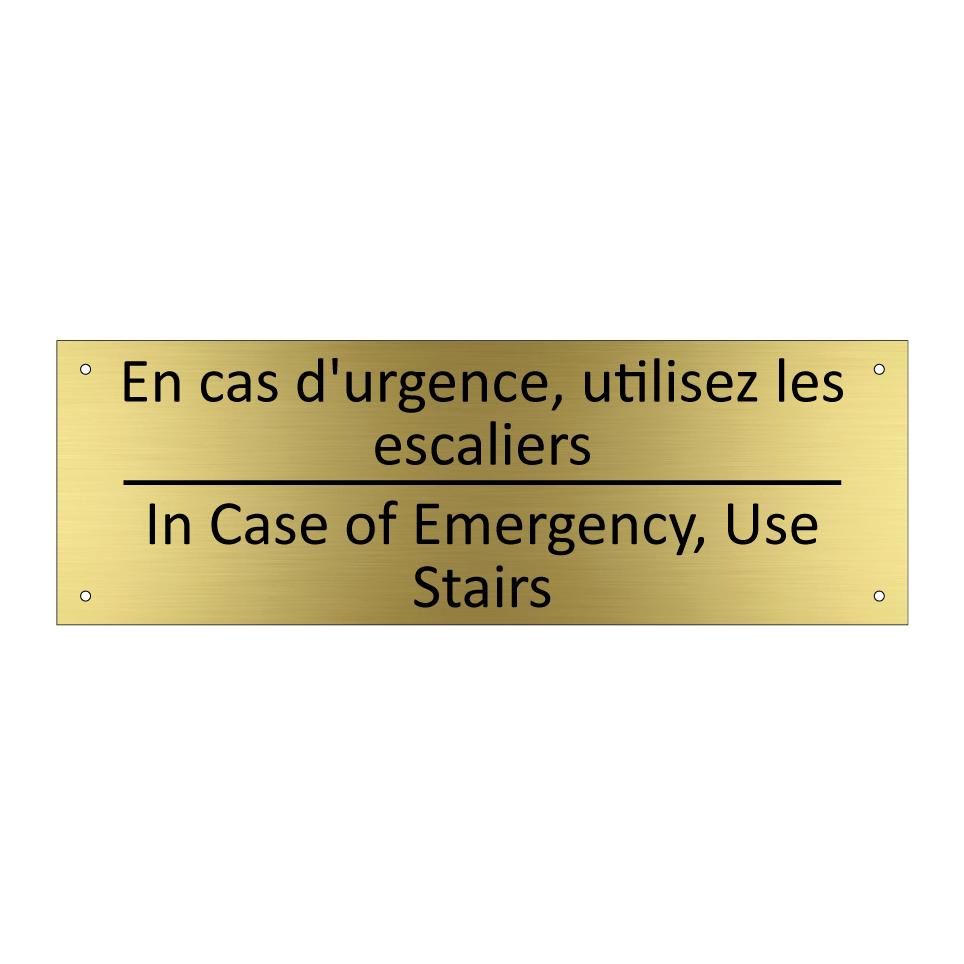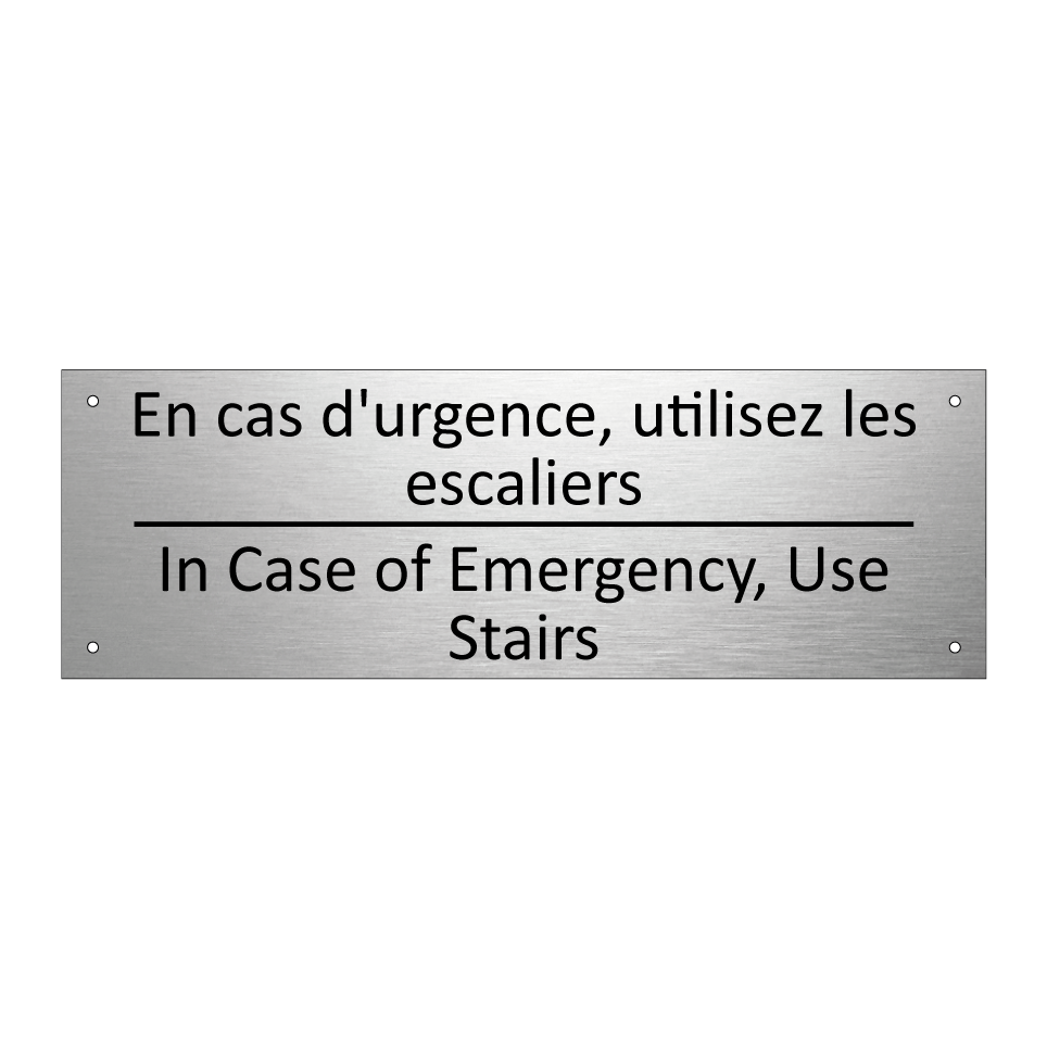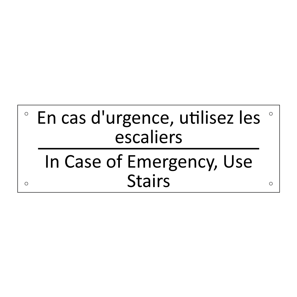 Panneau d'information avec le texte En cas d'urgence, utilisez les escaliers|In Case of Emergency, Use Stairs en français et en anglais.