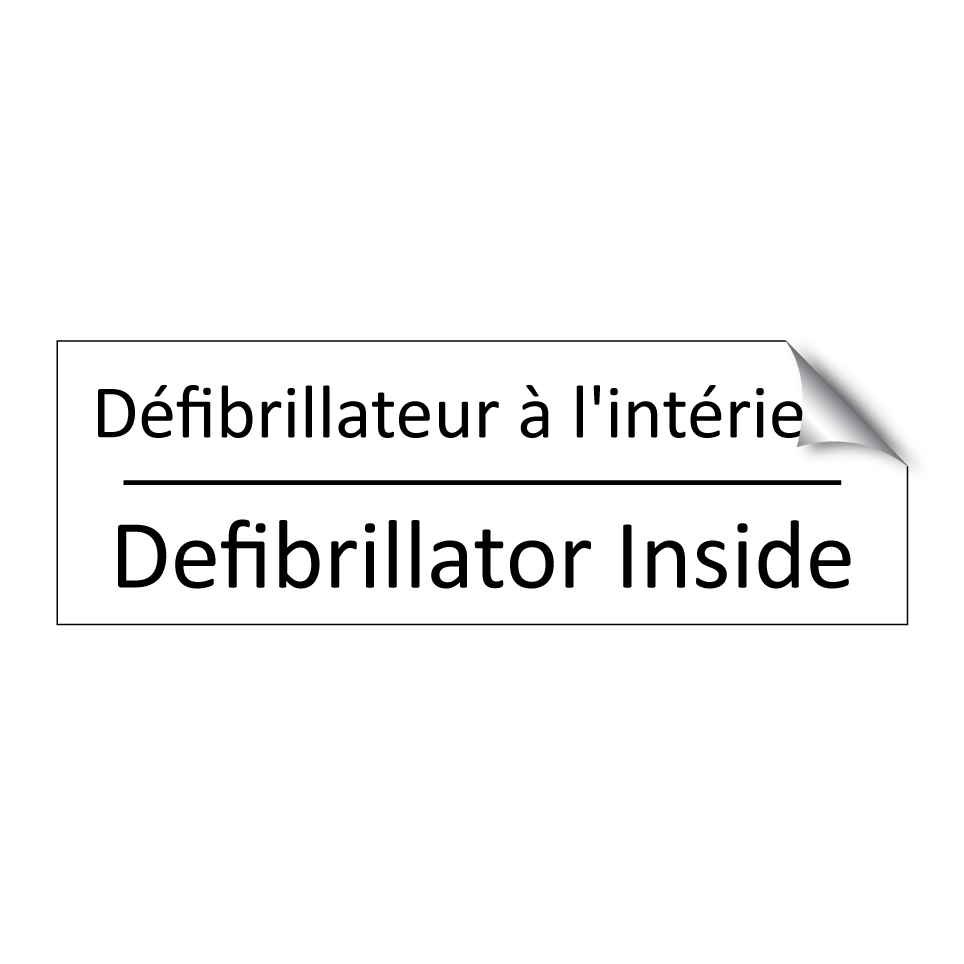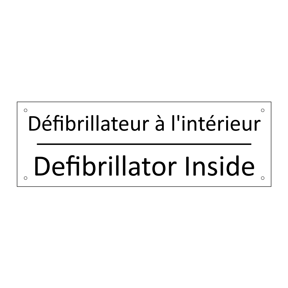 Panneau d'information avec le texte Défibrillateur à l'intérieur|Defibrillator Inside en français et en anglais.