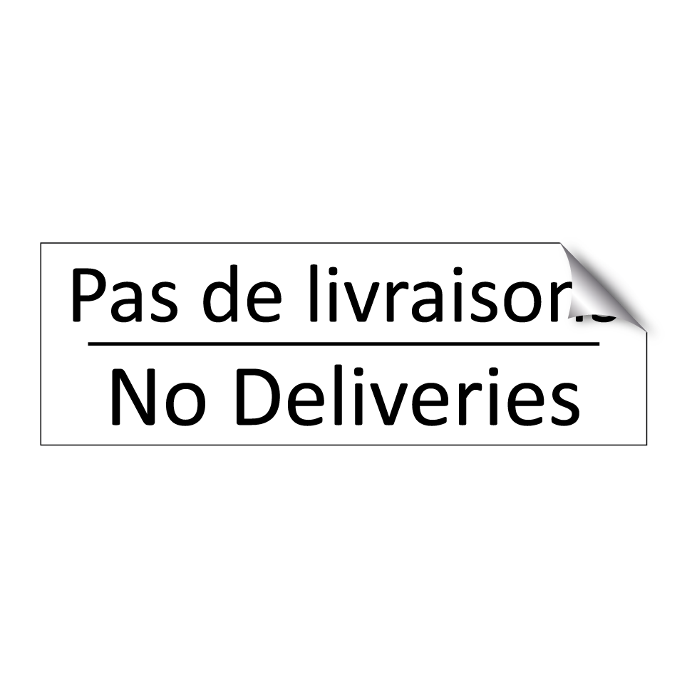 Panneau d'information avec le texte Pas de livraisons|No Deliveries en français et en anglais.
