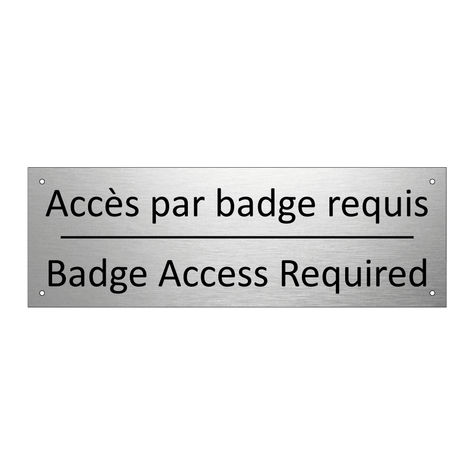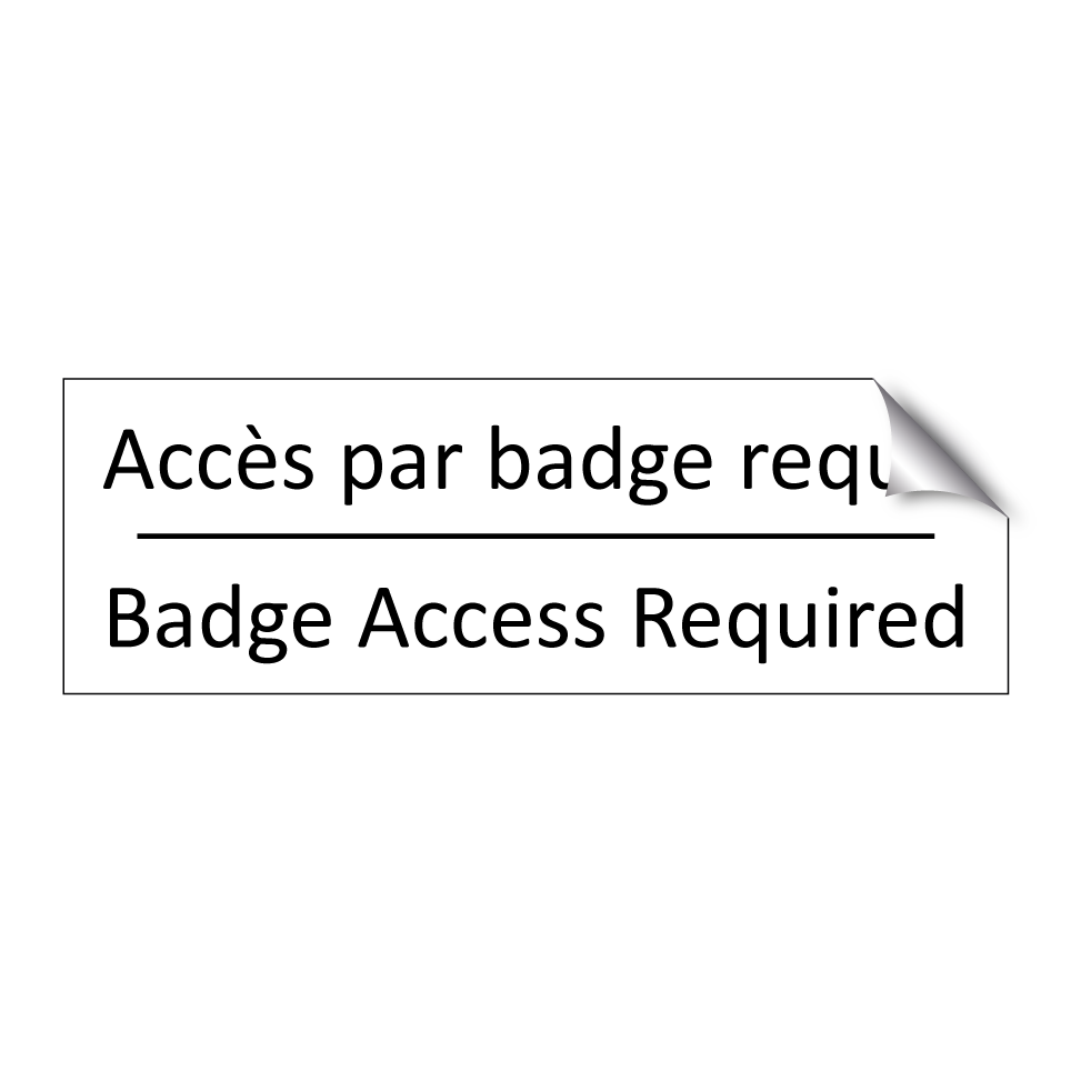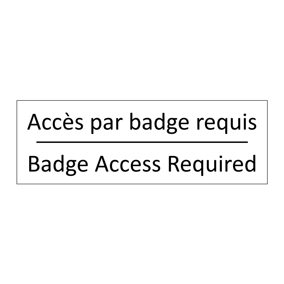 Panneau d'information avec le texte Accès par badge requis|Badge Access Required en français et en anglais.