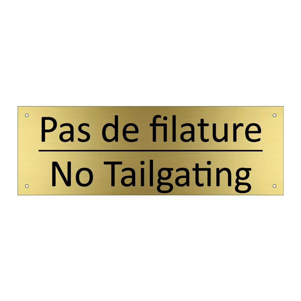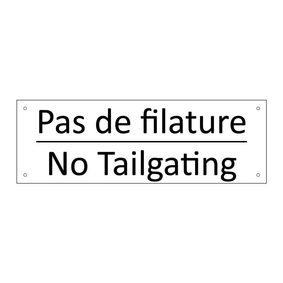 Panneau d'information avec le texte Pas de filature|No Tailgating en français et en anglais.