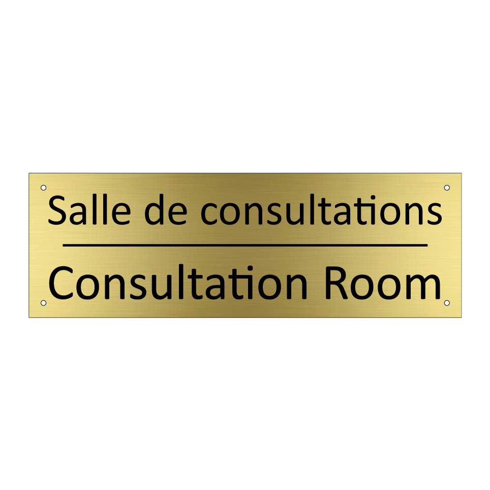 Panneau d'information avec le texte Salle de consultations|Consultation Room en français et en anglais.