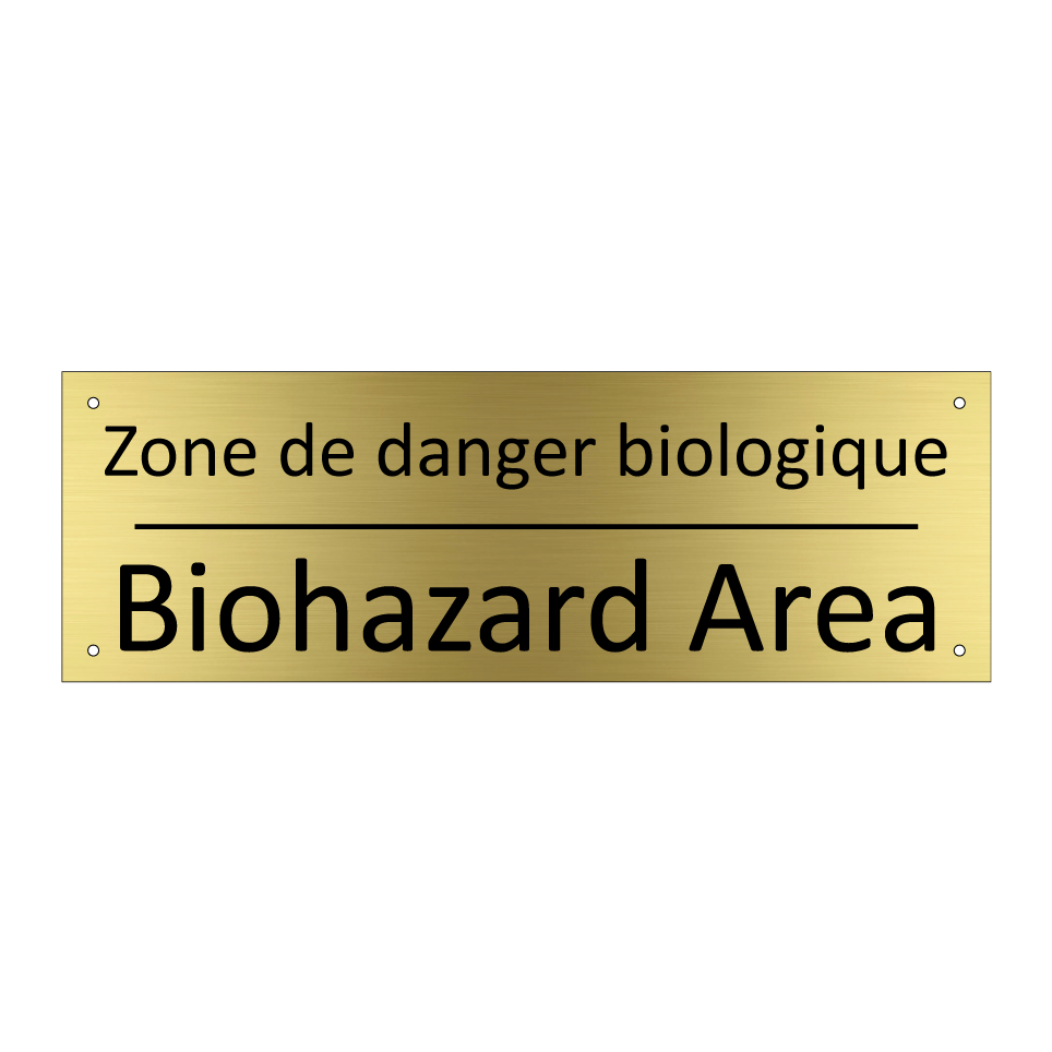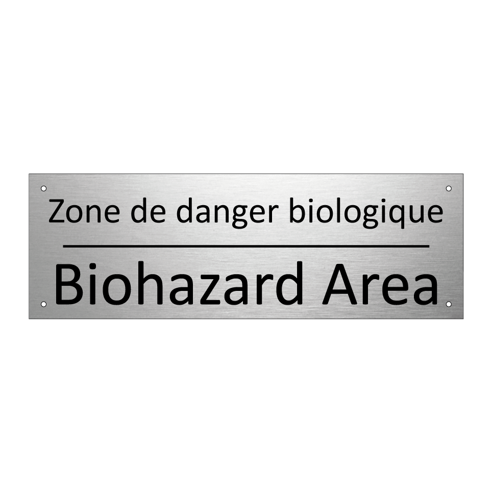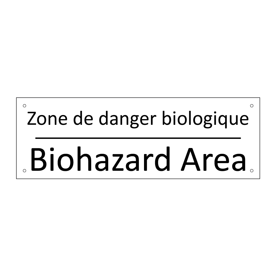 Panneau d'information avec le texte Zone de danger biologique|Biohazard Area en français et en anglais.